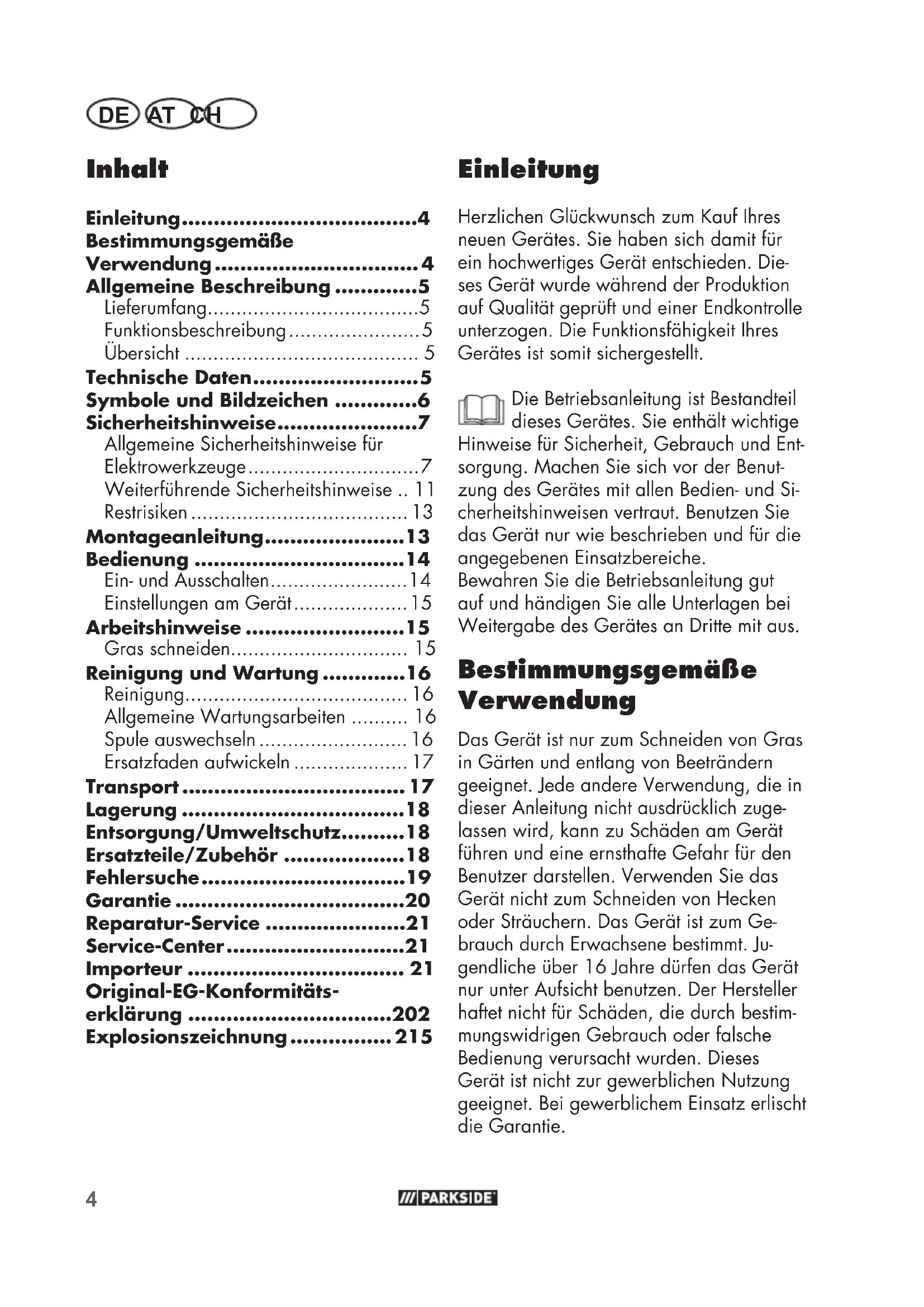 - Explosionszeichnung Einleitung Herzlichen Glückwunsch zum Kauf Ihres neuen Gerätes. Sie haben sich damit für ein hochwertiges Gerät entschieden. Die- ses Gerät wurde während der Produktion auf Qualität geprüft und einer Endkontrolle unterzogen. Die Funktionsfähigkeit Ihres Gerätes ist somit sichergestellt. Die Betriebsanleitung ist Bestandteil dieses Gerätes. Sie enthält wichtige Hinweise für Sicherheit, Gebrauch und Ent- sorgung. Machen Sie sich vor der Benut- zung des Gerätes mit allen Bedien- und Si- cherheitshinweisen vertraut. Benutzen Sie das Gerät nur wie beschrieben und für die angegebenen Einsatzbereiche. Bewahren Sie die Betriebsanleitung gut auf und händigen Sie alle Unterlagen bei Weitergabe des Gerätes an Dritte mit aus. Bestimmungsgemäße Verwendung Das Gerät ist nur zum Schneiden von Gras in Gärten und entlang von Beeträndern geeignet. Jede andere Verwendung, die in dieser Anleitung nicht ausdrücklich zuge- lassen wird, kann zu Schäden am Gerät führen und eine ernsthafte Gefahr für den Benutzer darstellen. Verwenden Sie das Gerät nicht zum Schneiden von Hecken oder Sträuchern. Das Gerät ist zum Ge- brauch durch Erwachsene bestimmt. Ju- gendliche über 16 Jahre dürfen das Gerät nur unter Aufsicht benutzen. Der Hersteller haftet nicht für Schäden, die durch bestim- mungswidrigen Gebrauch oder falsche Bedienung verursacht wurden. Dieses Gerät ist nicht zur gewerblichen Nutzung geeignet. Bei gewerblichem Einsatz erlischt die Garantie.5 DE AT CH Allgemeine Beschreibung Die Abbildung der wichtigs- ten Funktionsteile nden Sie auf der vorderen und der hinteren Ausklappseite. Lieferumfang Packen Sie das Gerät aus und kontrollieren Sie, ob es vollständig ist: - Elektro-Rasentrimmer - Schutzabdeckung - Fadenspule (bereits montiert) - Kreuzschlitzschrauben - Zusatzgriff - Betriebsanleitung Funktionsbeschreibung Der handgeführte und tragbare Elektro-Ra- sentrimmer besitzt als Schneideinrichtung eine Fadenspule. Zum Schutz des Anwenders ist das Gerät mit einer Schutzeinrichtung versehen, die die Schneideinrichtung abdeckt. Die Funktion der Bedienteile entnehmen Sie bitte den nachfolgenden Beschreibungen. Übersicht 1 Ein-/Ausschalter 2 Oberer Handgriff 3 Zugentlastung 4 Netzkabel 5 Griffteil 6 Mittelstück 7 Motorkopf 8 Schutzabdeckung 9 Schneidkopf 10 Zusatzgriff p. 215