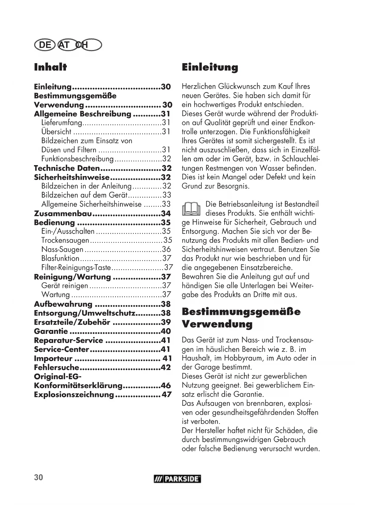 - Einleitung Herzlichen Glückwunsch zum Kauf Ihres neuen Gerätes. Sie haben sich damit für ein hochwertiges Produkt entschieden. Dieses Gerät wurde während der Produkti- on auf Qualität geprüft und einer Endkon- trolle unterzogen. Die Funktionsfähigkeit Ihres Gerätes ist somit sichergestellt. Es ist nicht auszuschließen, dass sich in Einzelfäl- len am oder im Gerät, bzw. in Schlauchlei- tungen Restmengen von Wasser benden. Dies ist kein Mangel oder Defekt und kein Grund zur Besorgnis. Die Betriebsanleitung ist Bestandteil dieses Produkts. Sie enthält wichti- ge Hinweise für Sicherheit, Gebrauch und Entsorgung. Machen Sie sich vor der Be- nutzung des Produkts mit allen Bedien- und Sicherheitshinweisen vertraut. Benutzen Sie das Produkt nur wie beschrieben und für die angegebenen Einsatzbereiche. Bewahren Sie die Anleitung gut auf und händigen Sie alle Unterlagen bei Weiter- gabe des Produkts an Dritte mit aus. Bestimmungsgemäße Verwendung Das Gerät ist zum Nass- und Trockensau- gen im häuslichen Bereich wie z.B. im Haushalt, im Hobbyraum, im Auto oder in der Garage bestimmt. Dieses Gerät ist nicht zur gewerblichen Nutzung geeignet. Bei gewerblichem Ein- satz erlischt die Garantie. Das Aufsaugen von brennbaren, explosi- ven oder gesundheitsgefährdenden Stoffen ist verboten. Der Hersteller haftet nicht für Schäden, die durch bestimmungswidrigen Gebrauch oder falsche Bedienung verursacht wurden. Original-EG- Konformitätserklärung p. 46