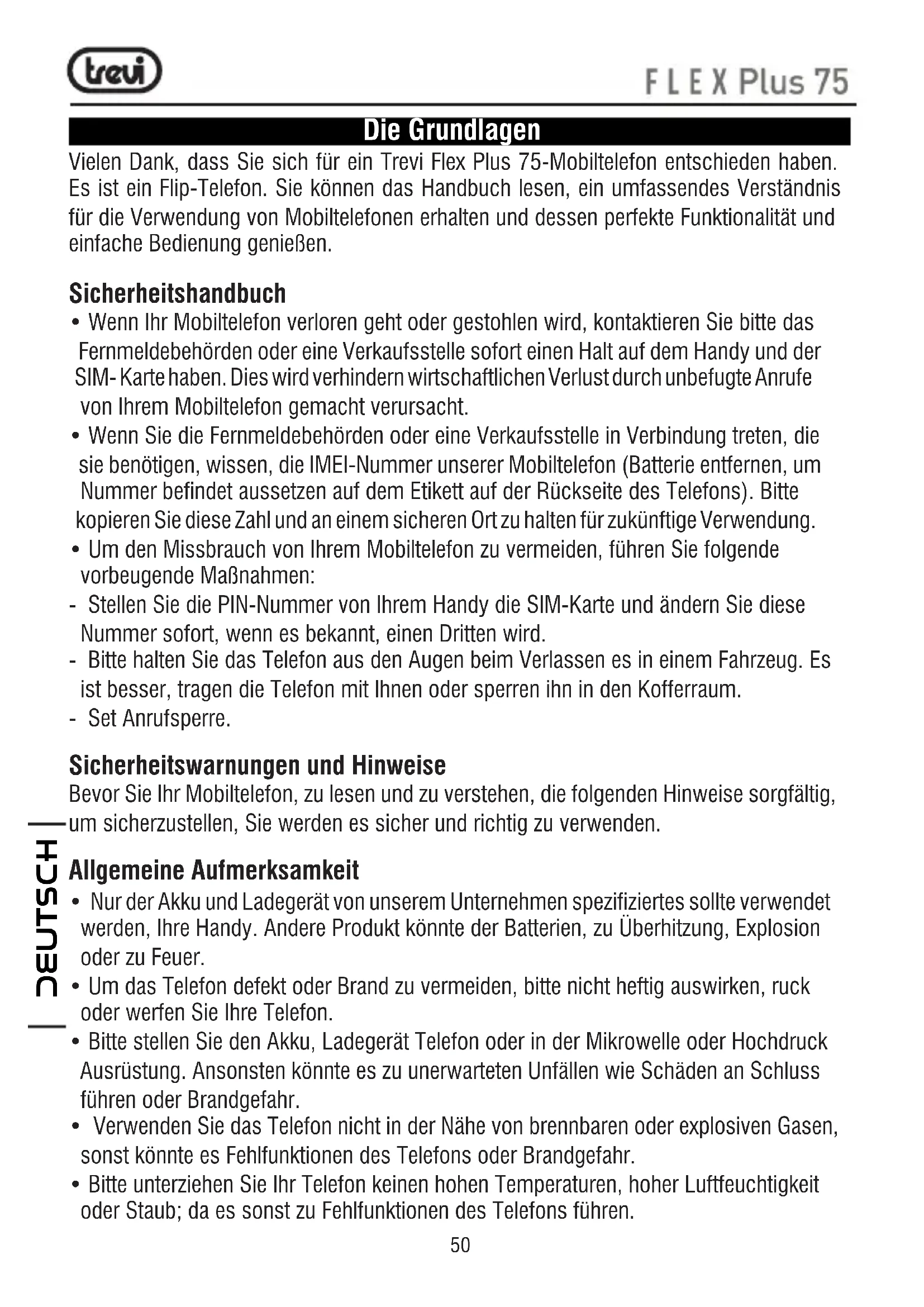 gemäß Gesetzesdekret Nr 49 von 14, März 2014 “Die Umsetzung der Richtlinie 2012/19/EU über die Entsorgung von Elektro- und Elektronik-Altgeräte (RAEE)”. Dieses Mülleimers Symbol auf dem Produkt zeigt an, dass muss am Ende seines Lebens von anderen Abfällen getrennt gesammelt werden. Der Benutzer muss daher nehmen die Fernbedienung die wesentlichen Komponenten integriert, die für elektronische und elektrotechnische Abfälle in die entsprechenden differenzierten Sammelstellen zu seinem Leben bekam, oder es an den Händler zurückgeben, wenn ein neues Gerät gleichwertiger Art Kauf in Bezug auf von 12.59 oder eine für Geräte mit längeren Seite von weniger als 25cm auf Null. Die angemessene, getrennte Sammlung für die stillgelegte Anlagen für Recycling, Aufbereitung und umweltgerechte Entsorgung trägt dazu bei, die Umwelt und die menschliche Gesundheit negative Auswirkungen zu vermeiden und begünstigt das Recycling der Materialien das Produkt zusammengesetzt. Illegal Dumping des Produkts durch den Benutzer Entails die Anwendung von Verwaltungssanktionen erklärte in Ge- setzesverordnung Nr. Dekr 49 von 14. März 2014. TREVI verfolgt eine Politik der kontinuierlichen Forschung und Entwicklung, damit die Produkte können andere Eigenschaften den beschriebenen zeigen. Technische daten Standard:........................................................................................ GSM GSM-Frequenzen: ...........................Quad Band 850/900/1800/1900MHz Anzeige: ............................................................................Haupt 2.8 Zoll Sekundär 1.77 Zoll Batterie: ........................ BL-U4U, wiederaufladbarer Li-ion 3,7V- 800mAh Autonomie (bei voller Ladung): ............................Stand-by: 240 Stunden ununterbrochene Abdeckung: ungefähr 4 Stunden Bluetooth: .......................................................................................V 2.0 Bluetooth-Sendeleistung: .............................................................2,5mW Bluetooth-Übertragungsband: ..................................................... 2,4GHz Abmessungen: .............................................................55x106,5x18mm Gewicht: .......................................................................107gr (mit Akku) DEUTSCH62 Häufige Fragen und Lösungen wenn Sie irgendwelche Fragen über das Telefon haben, finden Sie die Lösungen aus der untenstehenden Tabelle. FAQs Ursachen Lösungen Konnte nicht mit dem Netzwerk verbinden Die SIM-Karte ist ungültig. Kontaktieren Sie Ihren Netzbetreiber. Über die GSM-Abdeckung. Wenden Sie sich an den Netzbetreiber für die Service-Bereiche. Das Signal ist schwach. Wiederholen Sie bei einem stärkeren Signal-Bereich. Schlechter Empfang Wenn Sie Ihr Telefon in Gebieten mit schlechtem Empfang zu verwenden, zum Beispiel in der Nähe von hohen Gebäuden oder Grund Zimmer, die Funkwellen nicht effektiv übertragen werden. Vermeiden Sie dies, so weit wie Sie können. Wenn Sie Ihr Telefon an den Netzwerkverkehr, wie Arbeitszeit und off-duty Zeit verwenden, kann die Staus in schlechtem Empfang führen. Vermeiden Sie dies, so weit wie Sie können. Dies ist im Zusammenhang mit der Entfernung zur Basisstation in Frage. Sie können die Netzwerkdienstanbieter bitten, Service-Abdeckungskarte zu liefern. Echoes oder Geräusche Die Amtsleitung der Netzwerk ist in einem schlechten Zustand. Es ist ein regionales Problem. Hängen Sie den Anruf und wählen Sie erneut. Wählen Sie eine andere bessere Linie In einigen Bereichen sind die Call-Linien in schlechtem Zustand. Kürzere Wartezeit Die Standby-Zeit ist relevant für Netzwerkeinstellungen. In Gebieten mit schlechtem Empfang, schalten Sie Ihr Telefon vorübergehend. Ersetzen Sie die Batterien Change with a new battery. Wenn keine Signale empfangen werden, wird Ihr Telefon weiterhin auf der Suche nach Basisstationen, so verbrauchen eine große Menge an Batterieleistung und reduziert Standby-Zeit. Verwenden Sie Ihr Telefon bei starken Signalbereiche oder Schalten Sie das Telefon vorübergehend. Fehler beim Einschalten des Telefons Wird Die Batterie verwendet. Überprüfen Sie den Akku-Ladezustand oder die Batterie aufzuladen. DEUTSCH63 SIM-Kartenfehler Die SIM-Karte ist beschädigt. Kontaktieren Sie Ihren Netzbetreiber. Die SIM-Karte nicht richtig installiert ist. Sicherstellen, dass die SIM-Karte richtig installiert ist. Die metallische Fläche der SIM- Karte ist kontaminiert. Wischen Sie das Gesicht mit einem sauberen Tuch ab. Fehler beim Anruf Die Anrufsperre Funktion verwendet wird. Abbrechen der Anrufsperren. Die feste Rufnummer Funktion verwendet wird. Abbrechen der festen Wahlnummer- Einstellungen. PIN-Code-Fehler Geben falschen PIN-Code drei Mal in Folge. Kontaktieren Sie Ihren Netzbetreiber. Fehler beim Laden der Batterie Die Batterie oder das Ladegerät ist beschädigt. Ändern Sie einen neuen Akku oder Ladegerät. Laden Sie den Akku, wenn die Umgebungstemperatur niedriger als -10 ° C oder über 55 ° C Ändern Sie die Umwelt. Schlechte Verbindung. Prüfen Sie, ob der Stecker richtig angeschlossen ist. Fehler beim Kontakte zu Telefonbuch hinzufügen Der Speicherplatz des Telefonbuchs aufgebraucht ist. Löschen Sie einige Kontakte aus dem Telefonbuch. Konnte einige Funktionen einrichten Ihre Netzwerk-Service- Provider nicht die Dienstleistungen, oder Sie sie nicht abonniert haben. Kontaktieren Sie Ihren Netzbetreiber. DEUTSCH64 Los fundamentos Gracias por elegir el teléfono móvil Trevi Flex Plus 75. Es un teléfono plegable. Puede leer el manual, una comprensión completa del uso de los teléfonos móviles y disfrutar de su perfecta funcionalidad y sencillo método de operación. Guía de seguridad