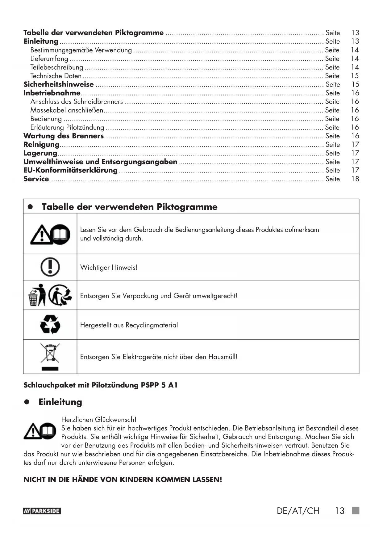 Tabelle der verwendeten Piktogramme Lesen Sie vor dem Gebrauch die Bedienungsanleitung dieses Produktes aufmerksam und vollständig durch. Wichtiger Hinweis! Entsorgen Sie Verpackung und Gerät umweltgerecht! Hergestellt aus Recyclingmaterial Entsorgen Sie Elektrogeräte nicht über den Hausmüll! Schlauchpaket mit Pilotzündung PSPP 5 A1 Einleitung Herzlichen Glückwunsch! Sie haben sich für ein hochwertiges Produkt entschieden. Die Betriebsanleitung ist Bestandteil dieses Produkts. Sie enthält wichtige Hinweise für Sicherheit, Gebrauch und Entsorgung. Machen Sie sich vor der Benutzung des Produkts mit allen Bedien- und Sicherheitshinweisen vertraut. Benutzen Sie das Produkt nur wie beschrieben und für die angegebenen Einsatzbereiche. Die Inbetriebnahme dieses Produk- tes darf nur durch unterwiesene Personen erfolgen. NICHT IN DIE HÄNDE VON KINDERN KOMMEN LASSEN! Tabelle der verwendeten Piktogramme ........................................................................... Seite 13 Einleitung ............................................................................................................................. Seite 13 Bestimmungsgemäße Verwendung .......................................................................................... Seite 14 Lieferumfang ........................................................................................................................ Seite 14 Teilebeschreibung ................................................................................................................. Seite 14 Technische Daten .................................................................................................................. Seite 15 Sicherheitshinweise ............................................................................................................ Seite 15 Inbetriebnahme ................................................................................................................... Seite 16 Anschluss des Schneidbrenners .............................................................................................. Seite 16 Massekabel anschließen ........................................................................................................ Seite 16 Bedienung ........................................................................................................................... Seite 16 Erläuterung Pilotzündung ....................................................................................................... Seite 16 Wartung des Brenners........................................................................................................ Seite 16 Reinigung ............................................................................................................................. Seite 17 Lagerung .............................................................................................................................. Seite 17 Umwelthinweise und Entsorgungsangaben ..................................................................... Seite 17 EU-Konformitätserklärung ................................................................................................. Seite 17 Service.................................................................................................................................. Seite 18 389165_2104_Schlauchpaket mit Pilotzuendung PSPP 5 A1_content_LB8.indb 13389165_2104_Schlauchpaket mit Pilotzuendung PSPP 5 A1_content_LB8.indb 13 12.10.21 15:2812.10.21 15:2814 DE/AT/CH Bestimmungsgemäße Verwendung Schlauchpaket mit Pilotzündung PSPP 5 A1 dient der Umrüstung der Parkside Plasmaschneider PPS 40 A1 und PPS 40 B2 auf Pilotzündung zum Plasmaschneiden . Das Gerät ist nicht für den gewerblichen Einsatz bestimmt. Benutzen Sie das Produkt nur wie beschrieben und für die angegebenen Einsatzbereiche. Bei gewerblichem Ein- satz erlischt die Garantie. Bewahren Sie diese Anleitung gut auf. Händigen Sie alle Unterlagen bei Weitergabe des Produkts an Dritte ebenfalls mit aus. Jegliche Anwendung, die von der bestimmungsgemäßen Verwendung abweicht, ist untersagt und potentiell gefährlich. Schäden durch Nichtbeachtung oder Fehlanwendung werden nicht von der Garantie abgedeckt und fallen nicht in den Haftungsbereich des Herstellers. Lieferumfang 1 Schlauchpaket mit Pilotbrenner 1 Bedienungsanleitung Teilebeschreibung HINWEIS: Überprüfen Sie unmittelbar nach dem Auspacken immer den Lieferumfang auf Vollständigkeit sowie den ein- wandfreien Zustand des Produkts. Benutzen Sie das Produkt nicht, wenn dieses defekt ist. Wenden Sie sich an den Hersteller über die angegebene Serviceadresse. Siehe hierzu Abb. A, B, C: