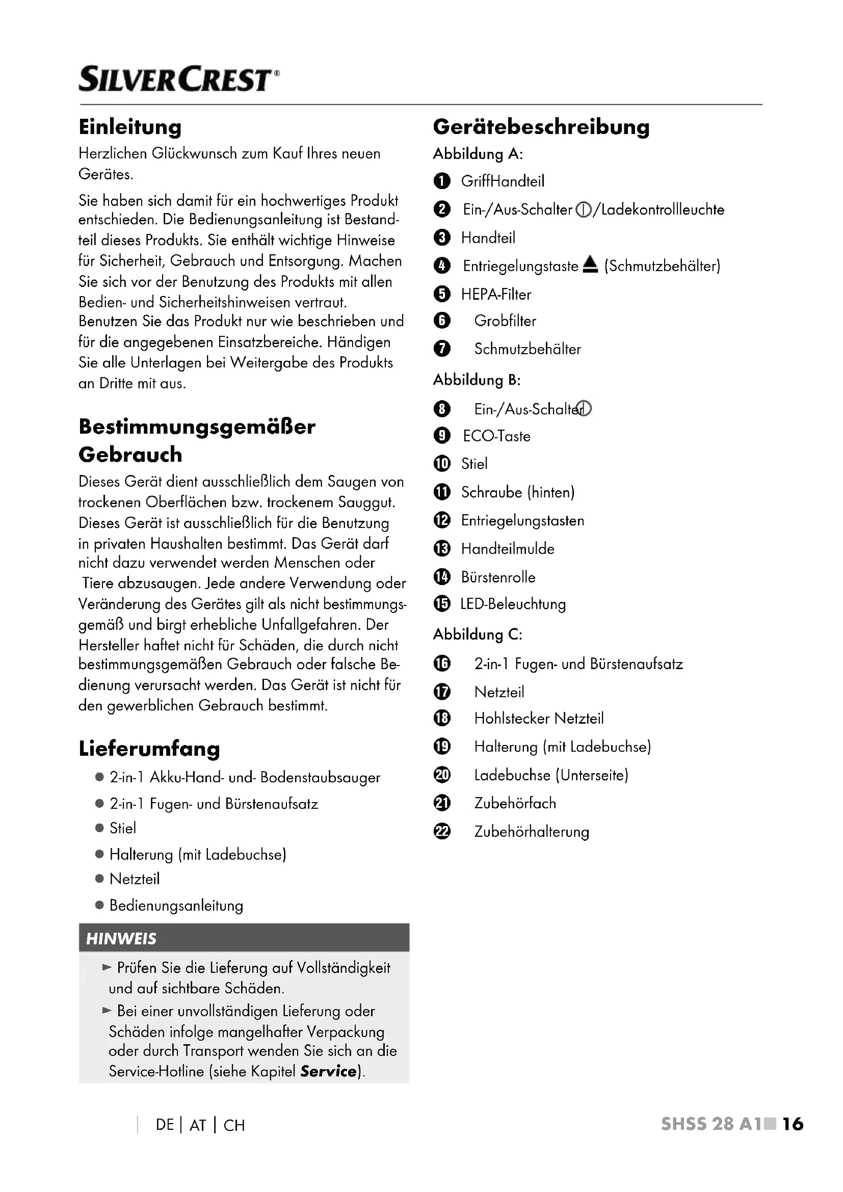 UN 34811 Tel. ____________ Das Produkt ist mit einem Lithium-Ionen-Akku ausgerüstet bzw. liegt dem Produkt bei. Werfen Sie die Akkus nicht ins Feuer und setzen Sie sie nicht hohen Temperaturen aus. Es besteht Explosionsgefahr! ► Benutzen Sie den Handstaubsauger nicht ohne eingesetzten HEPA-Filter. ► Benutzen Sie das Netzteil nicht für ein anderes Produkt und versuchen Sie nicht, dieses Gerät mittels eines anderen Netzteils aufzuladen. Ver- wenden Sie nur das mit diesem Gerät gelieferte Netzteil. ► Die Akkus in diesem Gerät können nicht ersetzt werden. ► Laden Sie niemals nicht wiederaufladbare Batterien auf! Verwenden Sie das Netzteil nur in Innenräumen.SHSS 28 A1