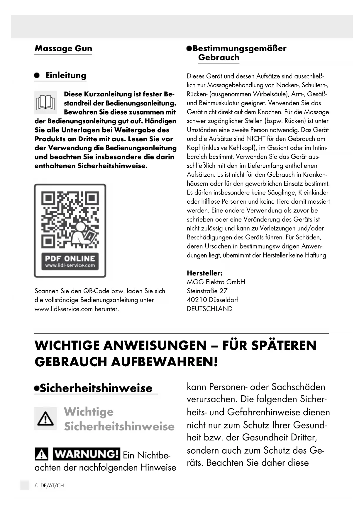 Sie alle Unterlagen bei Weitergabe des Produkts an Dritte mit aus. Lesen Sie vor der Verwendung die Bedienungsanleitung und beachten Sie insbesondere die darin enthaltenen Sicherheitshinweise. Scannen Sie den QR-Code bzw. laden Sie sich die vollständige Bedienungsanleitung unter www.lidl-service.com herunter. Bestimmungsgemäßer Gebrauch Dieses Gerät und dessen Aufsätze sind ausschließ- lich zur Massagebehandlung von Nacken-, Schultern-, Rücken- (ausgenommen Wirbelsäule), Arm-, Gesäß- und Beinmuskulatur geeignet. Verwenden Sie das Gerät nicht direkt auf dem Knochen. Für die Massage schwer zugänglicher Stellen (bspw. Rücken) ist unter Umständen eine zweite Person notwendig. Das Gerät und die Aufsätze sind NICHT für den Gebrauch am Kopf (inklusive Kehlkopf), im Gesicht oder im Intim- bereich bestimmt. Verwenden Sie das Gerät aus- schließlich mit den im Lieferumfang enthaltenen Aufsätzen. Es ist nicht für den Gebrauch in Kranken- häusern oder für den gewerblichen Einsatz bestimmt. Es dürfen insbesondere keine Säuglinge, Kleinkinder oder hilflose Personen und keine Tiere damit massiert werden. Eine andere Verwendung als zuvor be- schrieben oder eine Veränderung des Geräts ist nicht zulässig und kann zu Verletzungen und/oder Beschädigungen des Geräts führen. Für Schäden, deren Ursachen in bestimmungswidrigen Anwen- dungen liegt, übernimmt der Hersteller keine Haftung. Hersteller: MGG Elektro GmbH Steinstraße 27 40210 Düsseldorf DEUTSCHLAND