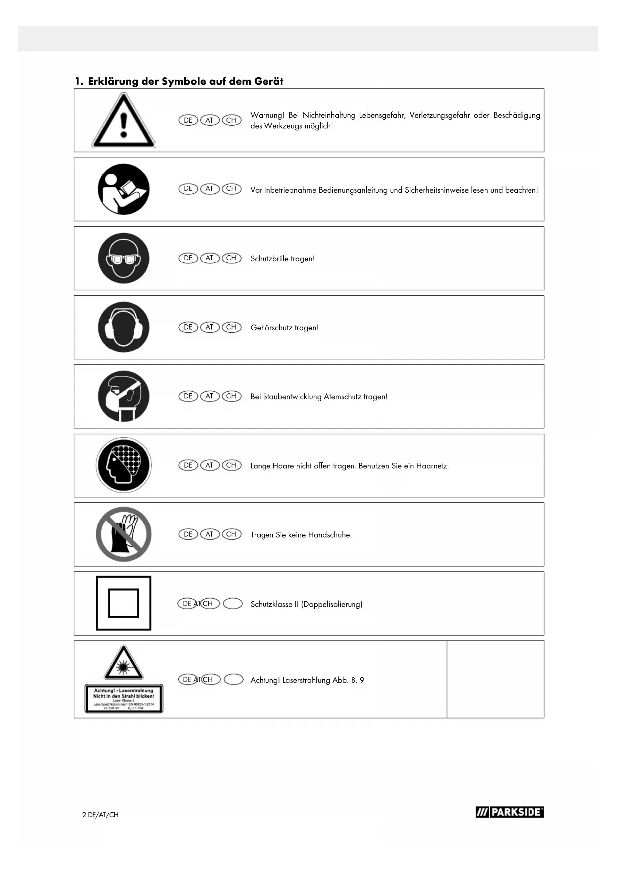 Tragen Sie keine Handschuhe. DE AT CH Schutzklasse II (Doppelisolierung) DE AT CH Achtung! Laserstrahlung Abb. 8, 93DE/AT/CH