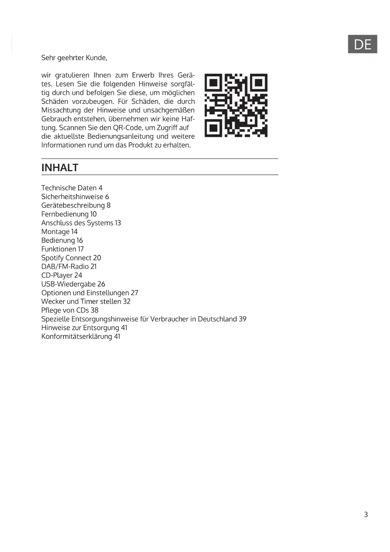INHALT Technische Daten 4 Sicherheitshinweise 6 Gerätebeschreibung 8 Fernbedienung 10 Anschluss des Systems 13 Montage 14 Bedienung 16 Funktionen 17 Spotify Connect 20 DAB/FM-Radio 21 CD-Player 24 USB-Wiedergabe 26 Optionen und Einstellungen 27 Wecker und Timer stellen 32 Pege von CDs 38 Spezielle Entsorgungshinweise für Verbraucher in Deutschland 39 Hinweise zur Entsorgung 41 Konformitätserklärung 41 Sehr geehrter Kunde, wir gratulieren Ihnen zum Erwerb Ihres Gerä- tes. Lesen Sie die folgenden Hinweise sorgfäl- tig durch und befolgen Sie diese, um möglichen Schäden vorzubeugen. Für Schäden, die durch Missachtung der Hinweise und unsachgemäßen Gebrauch entstehen, übernehmen wir keine Haf- tung. Scannen Sie den QR-Code, um Zugri auf die aktuellste Bedienungsanleitung und weitere Informationen rund um das Produkt zu erhalten.4