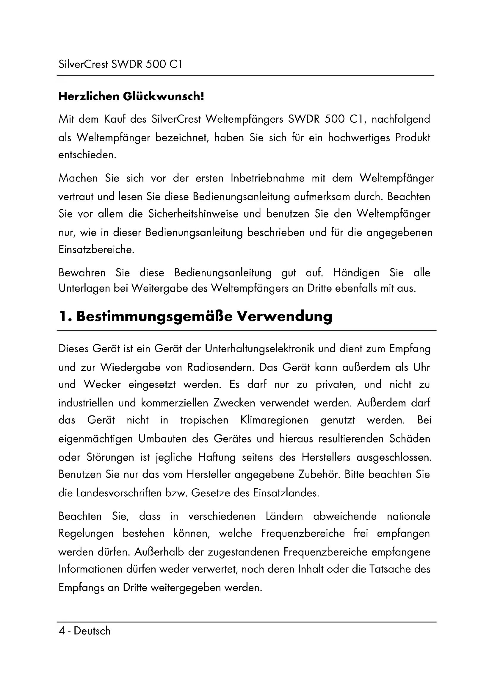 Dieses Gerät ist ein Gerät der Unterhaltungselektronik und dient zum Empfang und zur Wiedergabe von Radiosendern. Das Gerät kann außerdem als Uhr und Wecker eingesetzt werden. Es darf nur zu privaten, und nicht zu industriellen und kommerziellen Zwecken verwendet werden. Außerdem darf das Gerät nicht in tropischen Klimaregionen genutzt werden. Bei eigenmächtigen Umbauten des Gerätes und hieraus resultierenden Schäden oder Störungen ist jegliche Haftung seitens des Herstellers ausgeschlossen. Benutzen Sie nur das vom Hersteller angegebene Zubehör. Bitte beachten Sie die Landesvorschriften bzw. Gesetze des Einsatzlandes. Beachten Sie, dass in verschiedenen Ländern abweichende nationale Regelungen bestehen können, welche Frequenzbereiche frei empfangen werden dürfen. Außerhalb der zugestandenen Frequenzbereiche empfangene Informationen dürfen weder verwertet, noch deren Inhalt oder die Tatsache des Empfangs an Dritte weitergegeben werden.SilverCrest SWDR 500 C1 Deutsch - 5