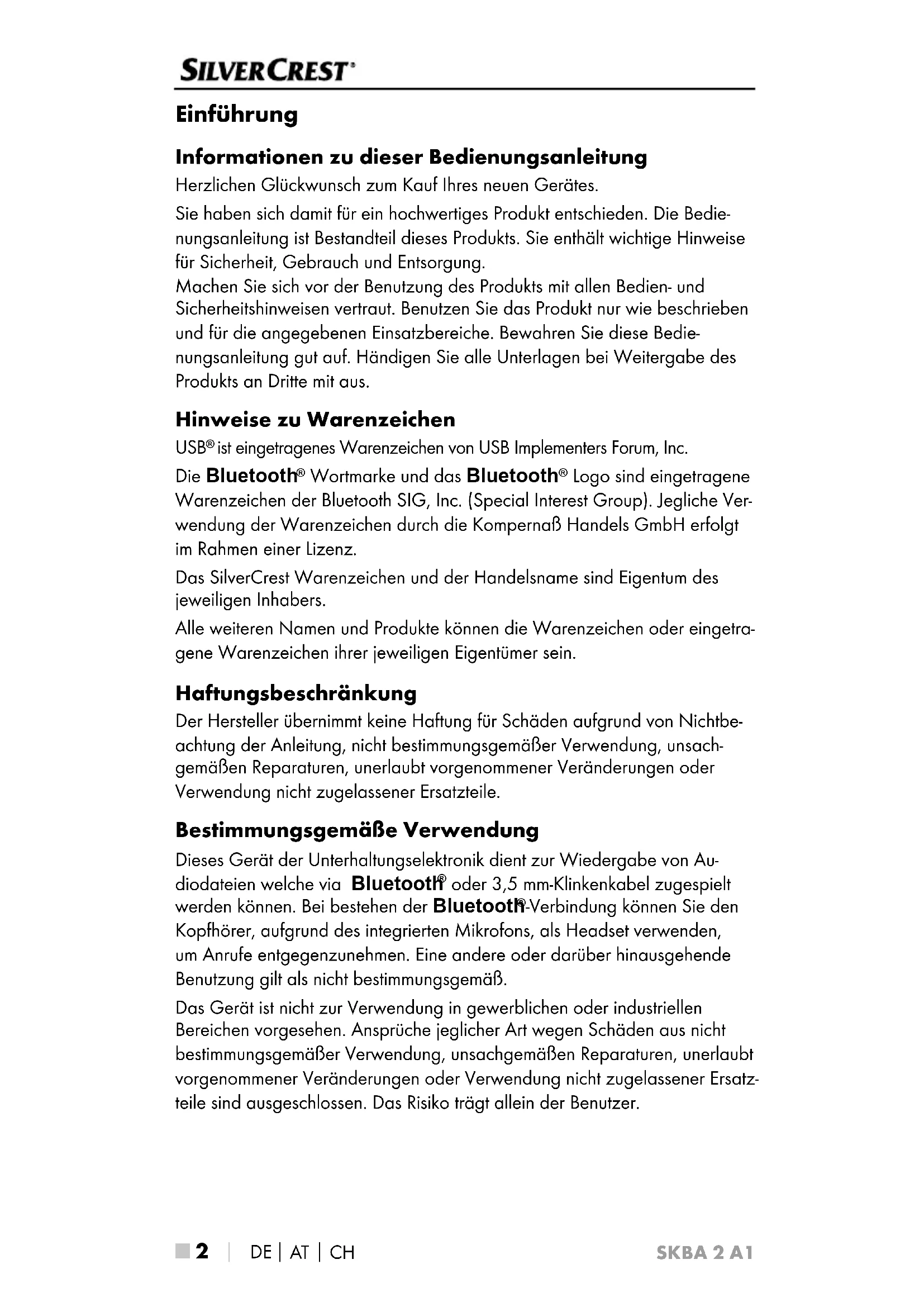 Logo sind eingetragene Warenzeichen der Bluetooth SIG, Inc. (Special Interest Group). Jegliche Ver- wendung der Warenzeichen durch die Kompernaß Handels GmbH erfolgt im Rahmen einer Lizenz. Das SilverCrest Warenzeichen und der Handelsname sind Eigentum des jeweiligen Inhabers. Alle weiteren Namen und Produkte können die Warenzeichen oder eingetra- gene Warenzeichen ihrer jeweiligen Eigentümer sein. Haftungsbeschränkung Der Hersteller übernimmt keine Haftung für Schäden aufgrund von Nichtbe- achtung der Anleitung, nicht bestimmungsgemäßer Verwendung, unsach- gemäßen Reparaturen, unerlaubt vorgenommener Veränderungen oder Verwendung nicht zugelassener Ersatzteile. Bestimmungsgemäße Verwendung Dieses Gerät der Unterhaltungselektronik dient zur Wiedergabe von Au- diodateien welche via Bluetooth