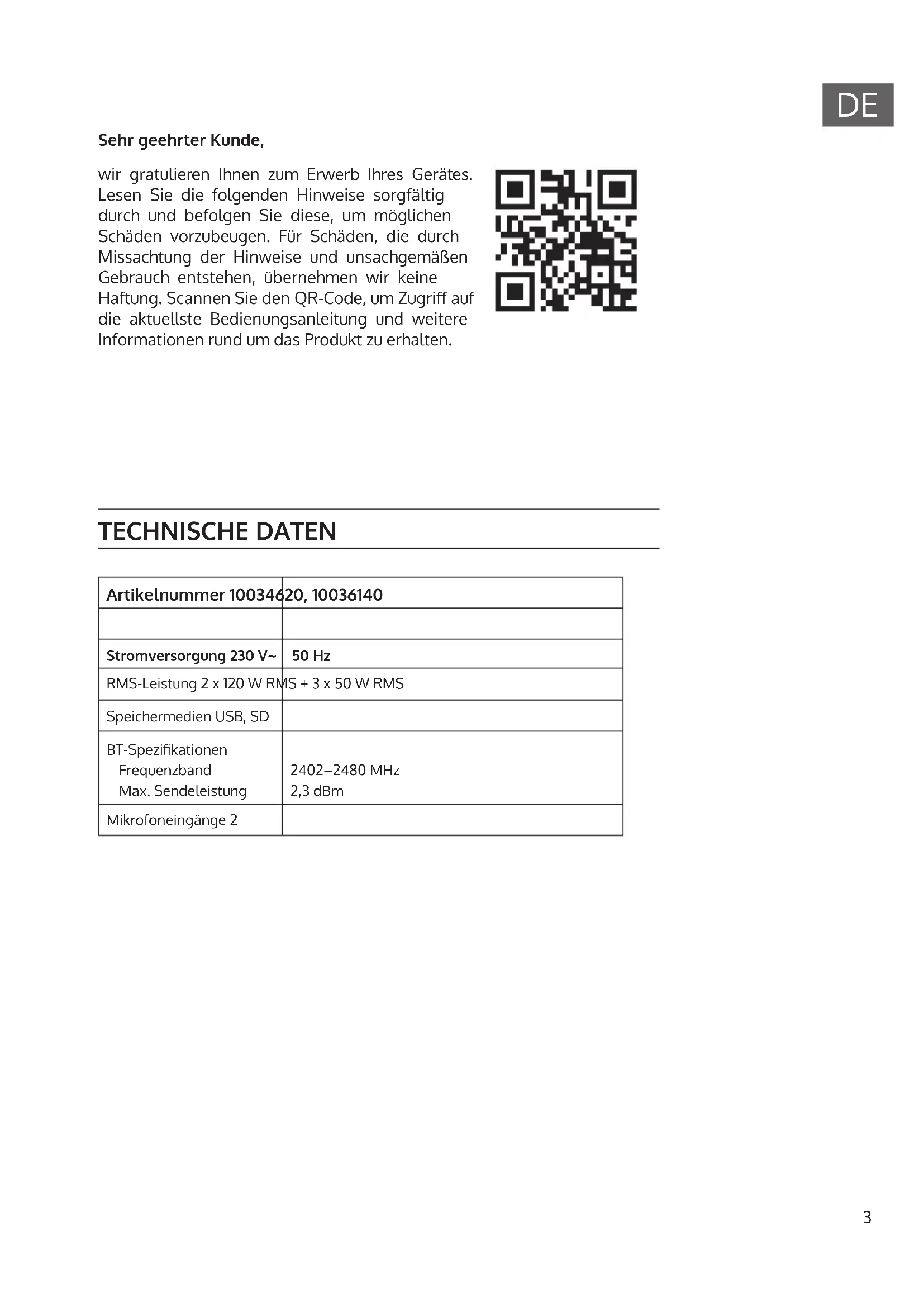 TECHNISCHE DATEN Artikelnummer 10034620, 10036140 Stromversorgung 230 V~ 50 Hz RMS-Leistung 2 x 120 W RMS + 3 x 50 W RMS Speichermedien USB, SD BT-Spezikationen Frequenzband Max. Sendeleistung 2402–2480MHz 2,3dBm Mikrofoneingänge 2 Sehr geehrter Kunde, wir gratulieren Ihnen zum Erwerb Ihres Gerätes. Lesen Sie die folgenden Hinweise sorgfältig durch und befolgen Sie diese, um möglichen Schäden vorzubeugen. Für Schäden, die durch Missachtung der Hinweise und unsachgemäßen Gebrauch entstehen, übernehmen wir keine Haftung. Scannen Sie den QR-Code, um Zugri auf die aktuellste Bedienungsanleitung und weitere Informationen rund um das Produkt zu erhalten.4