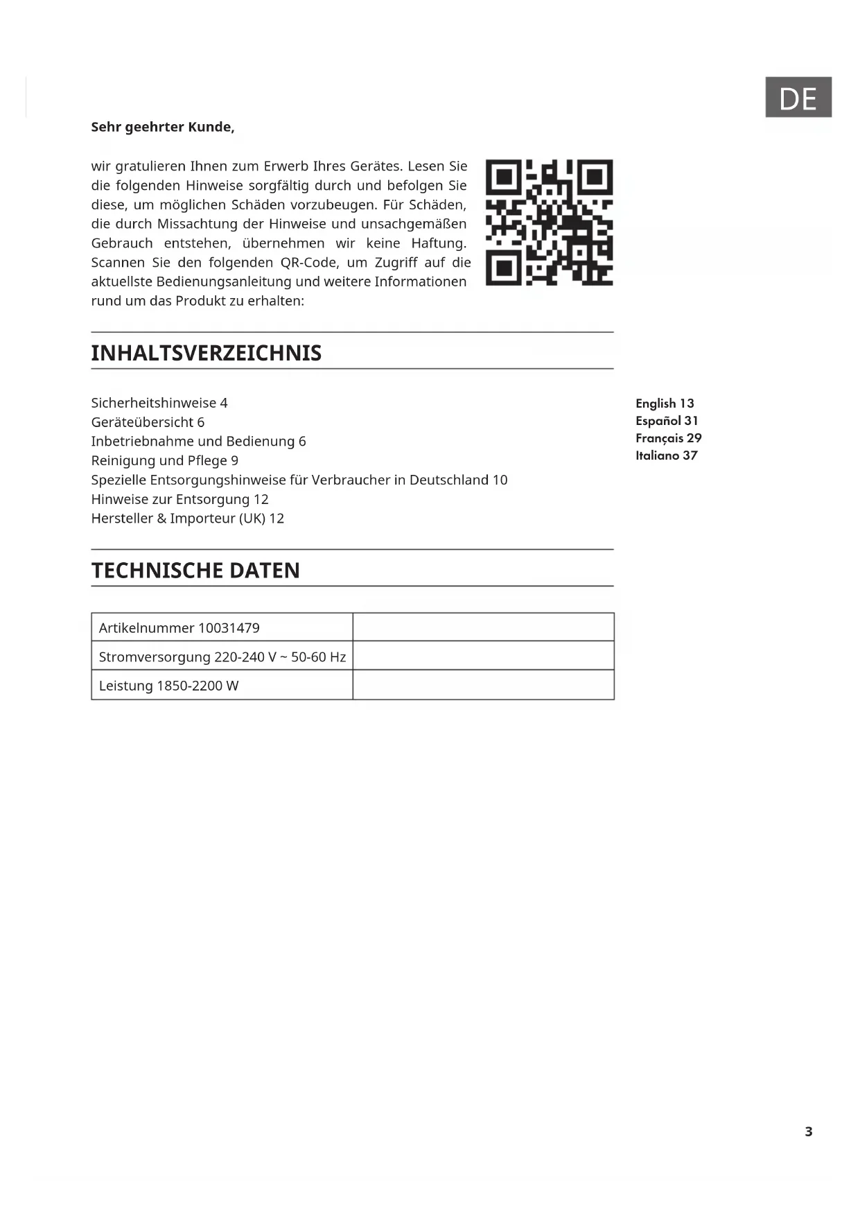 Sehr geehrter Kunde, wir gratulieren Ihnen zum Erwerb Ihres Gerätes. Lesen Sie die folgenden Hinweise sorgfältig durch und befolgen Sie diese, um möglichen Schäden vorzubeugen. Für Schäden, die durch Missachtung der Hinweise und unsachgemäßen Gebrauch entstehen, übernehmen wir keine Haftung. Scannen Sie den folgenden QR-Code, um Zugri auf die aktuellste Bedienungsanleitung und weitere Informationen rund um das Produkt zu erhalten: INHALTSVERZEICHNIS Sicherheitshinweise 4 Geräteübersicht 6 Inbetriebnahme und Bedienung 6 Reinigung und Pege 9 Spezielle Entsorgungshinweise für Verbraucher in Deutschland 10 Hinweise zur Entsorgung 12 Hersteller & Importeur (UK) 12 TECHNISCHE DATEN Artikelnummer 10031479 Stromversorgung 220-240 V ~ 50-60 Hz Leistung 1850-2200 W English 13 Español 31 Français 29 Italiano 374
