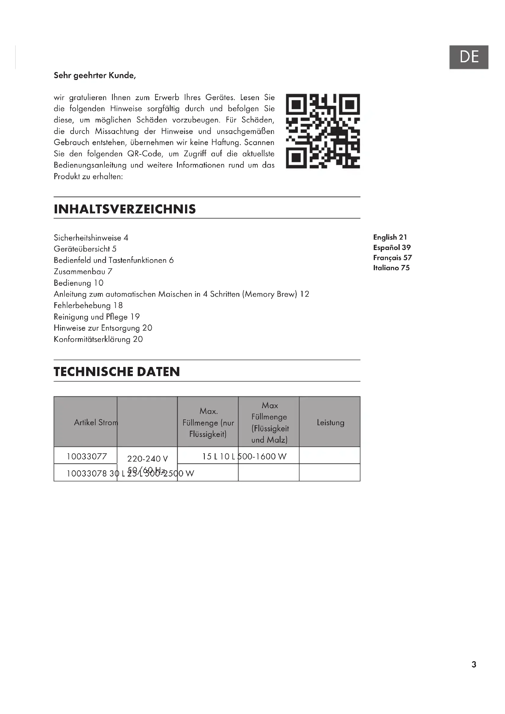 Sehr geehrter Kunde, wir gratulieren Ihnen zum Erwerb Ihres Gerätes. Lesen Sie die folgenden Hinweise sorgfältig durch und befolgen Sie diese, um möglichen Schäden vorzubeugen. Für Schäden, die durch Missachtung der Hinweise und unsachgemäßen Gebrauch entstehen, übernehmen wir keine Haftung. Scannen Sie den folgenden QR-Code, um Zugriff auf die aktuellste Bedienungsanleitung und weitere Informationen rund um das Produkt zu erhalten: INHALTSVERZEICHNIS Sicherheitshinweise4 Geräteübersicht5 Bedienfeld und Tastenfunktionen6 Zusammenbau7 Bedienung10 Anleitung zum automatischen Maischen in 4 Schritten (Memory Brew)12 Fehlerbehebung18 Reinigung und Pege19 Hinweise zur Entsorgung20 Konformitätserklärung20 TECHNISCHE DATEN Artikel Strom Max. Füllmenge (nur Flüssigkeit) Max Füllmenge (Flüssigkeit und Malz) Leistung