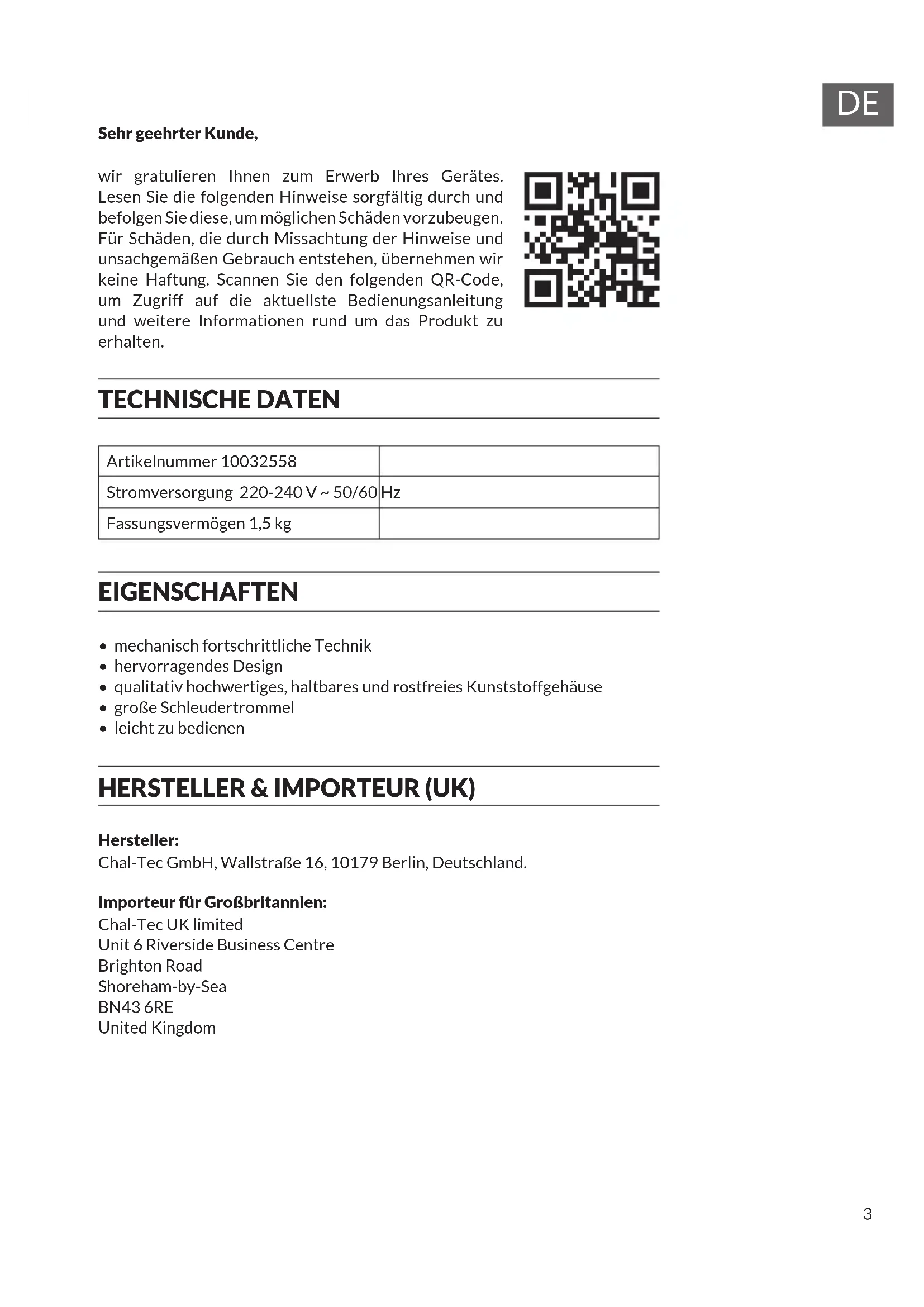 - leicht zu bedienen HERSTELLER & IMPORTEUR (UK) Hersteller: Chal-Tec GmbH, Wallstraße 16, 10179 Berlin, Deutschland. Importeur für Großbritannien: Chal-Tec UK limited Unit 6 Riverside Business Centre Brighton Road Shoreham-by-Sea BN43 6RE United Kingdom4