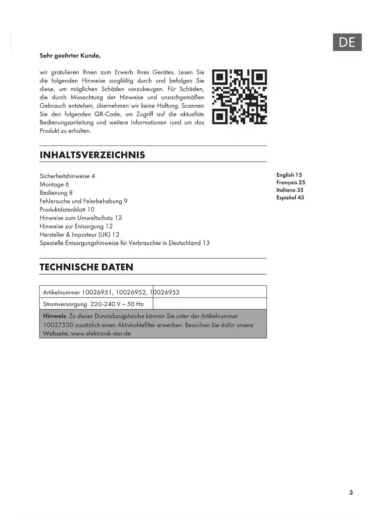 English 15 Français 25 Italiano 35 Español 45 Sehr geehrter Kunde, wir gratulieren Ihnen zum Erwerb Ihres Gerätes. Lesen Sie die folgenden Hinweise sorgfältig durch und befolgen Sie diese, um möglichen Schäden vorzubeugen. Für Schäden, die durch Missachtung der Hinweise und unsachgemäßen Gebrauch entstehen, übernehmen wir keine Haftung. Scannen Sie den folgenden QR-Code, um Zugriff auf die aktuellste Bedienungsanleitung und weitere Informationen rund um das Produkt zu erhalten. INHALTSVERZEICHNIS Sicherheitshinweise4 Montage6 Bedienung8 Fehlersuche und Felerbehebung9 Produktdatenblatt10 Hinweise zum Umweltschutz12 Hinweise zur Entsorgung12 Hersteller & Importeur (UK)12 Spezielle Entsorgungshinweise für Verbraucher in Deutschland13 TECHNISCHE DATEN Artikelnummer 10026951, 10026952, 10026953 Stromversorgung 220-240 V ~ 50 Hz Hinweis: Zu dieser Dunstabzugshaube können Sie unter der Artikelnummer 10027530 zusätzlich einen Aktivkohlelter erwerben. Besuchen Sie dafür unsere Webseite: www.elektronik-star.de4