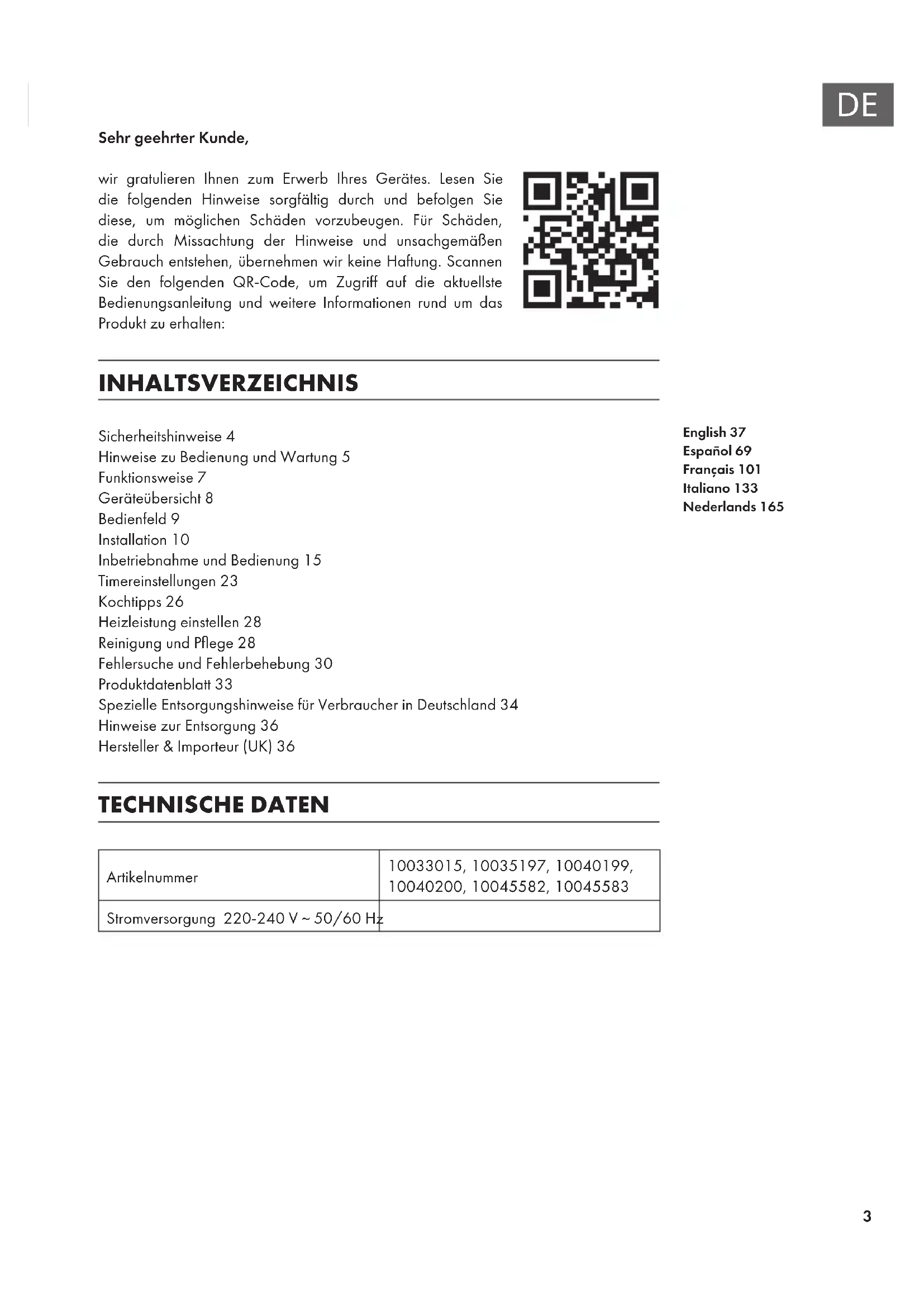 Sehr geehrter Kunde, wir gratulieren Ihnen zum Erwerb Ihres Gerätes. Lesen Sie die folgenden Hinweise sorgfältig durch und befolgen Sie diese, um möglichen Schäden vorzubeugen. Für Schäden, die durch Missachtung der Hinweise und unsachgemäßen Gebrauch entstehen, übernehmen wir keine Haftung. Scannen Sie den folgenden QR-Code, um Zugriff auf die aktuellste Bedienungsanleitung und weitere Informationen rund um das Produkt zu erhalten: INHALTSVERZEICHNIS Sicherheitshinweise4 Hinweise zu Bedienung und Wartung5 Funktionsweise7 Geräteübersicht8 Bedienfeld9 Installation10 Inbetriebnahme und Bedienung15 Timereinstellungen23 Kochtipps26 Heizleistung einstellen28 Reinigung und Pege28 Fehlersuche und Fehlerbehebung30 Produktdatenblatt33 Spezielle Entsorgungshinweise für Verbraucher in Deutschland34 Hinweise zur Entsorgung36 Hersteller & Importeur (UK)36 TECHNISCHE DATEN Artikelnummer 10033015, 10035197, 10040199, 10040200, 10045582, 10045583 Stromversorgung 220-240 V ~ 50/60 Hz English 37 Español 69 Français 101 Italiano 133 Nederlands 1654