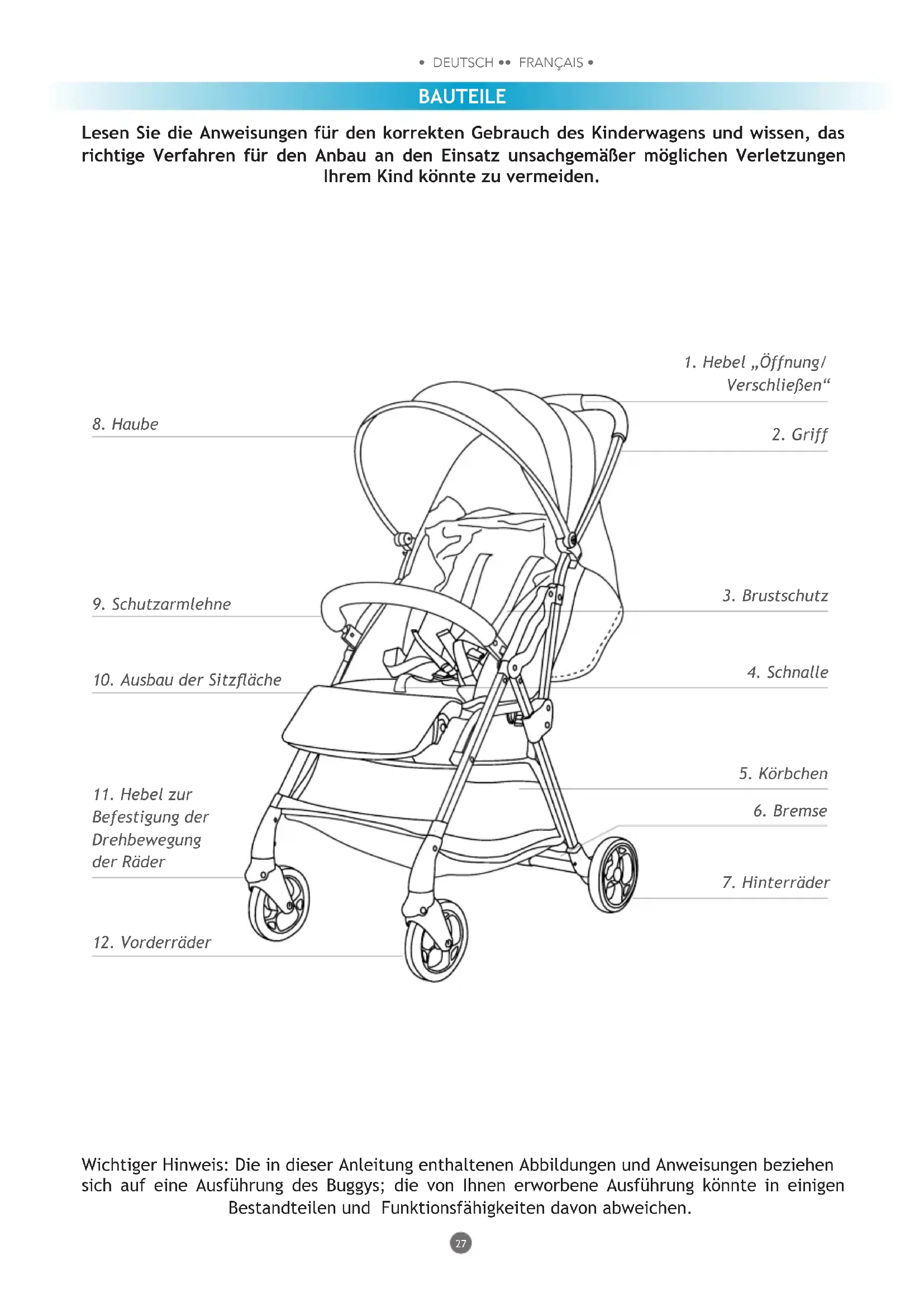 - DEUTSCH •• FRANÇAIS • Lesen Sie die Anweisungen für den korrekten Gebrauch des Kinderwagens und wissen, das richtige Verfahren für den Anbau an den Einsatz unsachgemäßer möglichen Verletzungen Ihrem Kind könnte zu vermeiden. BAUTEILE Wichtiger Hinweis: Die in dieser Anleitung enthaltenen Abbildungen und Anweisungen beziehen sich auf eine Ausführung des Buggys; die von Ihnen erworbene Ausführung könnte in einigen Bestandteilen und Funktionsfähigkeiten davon abweichen.