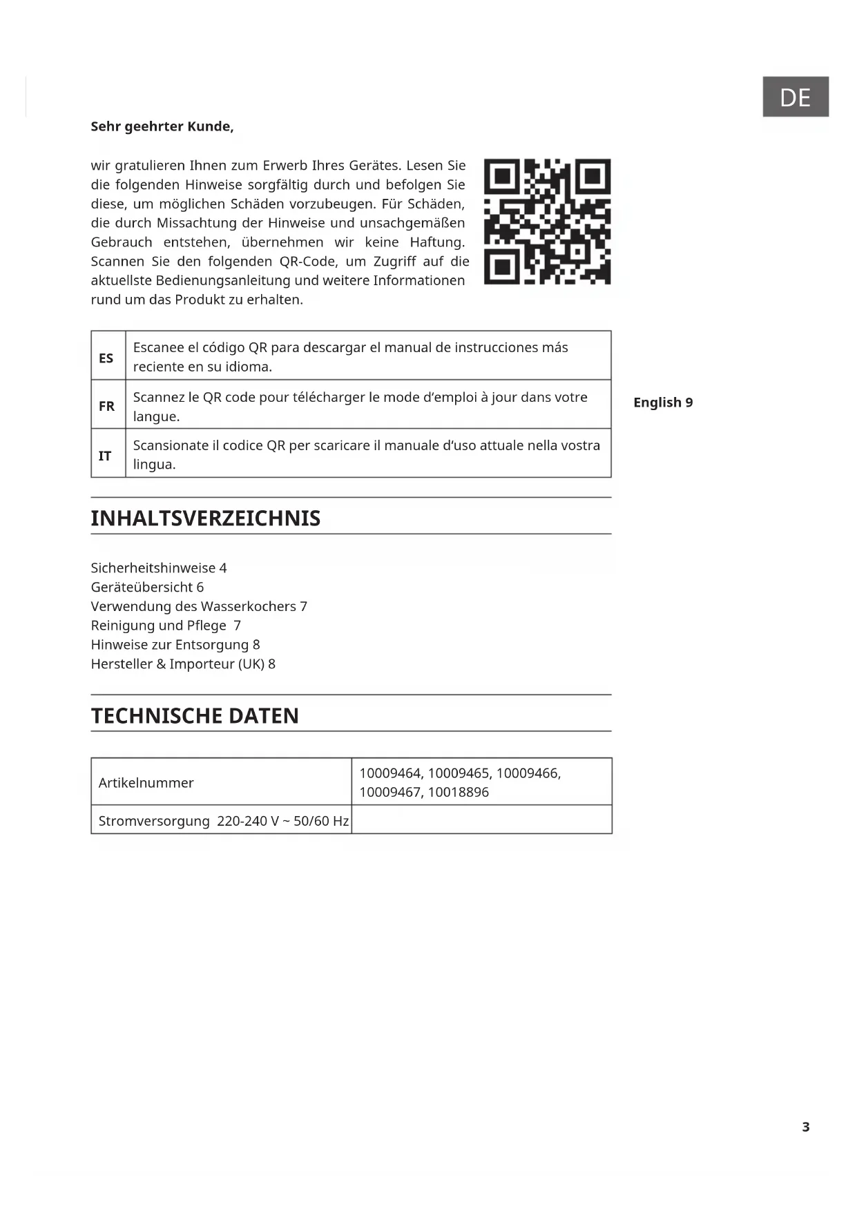 Scansionate il codice QR per scaricare il manuale d‘uso attuale nella vostra lingua. INHALTSVERZEICHNIS Sicherheitshinweise 4 Geräteübersicht 6 Verwendung des Wasserkochers 7 Reinigung und Pege 7 Hinweise zur Entsorgung 8 Hersteller & Importeur (UK) 8 TECHNISCHE DATEN Artikelnummer 10009464, 10009465, 10009466, 10009467, 10018896 Stromversorgung 220-240 V ~ 50/60 Hz English 9 Español Français Italiano4