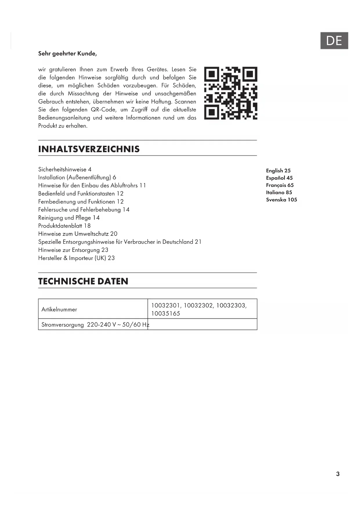 Sehr geehrter Kunde, wir gratulieren Ihnen zum Erwerb Ihres Gerätes. Lesen Sie die folgenden Hinweise sorgfältig durch und befolgen Sie diese, um möglichen Schäden vorzubeugen. Für Schäden, die durch Missachtung der Hinweise und unsachgemäßen Gebrauch entstehen, übernehmen wir keine Haftung. Scannen Sie den folgenden QR-Code, um Zugriff auf die aktuellste Bedienungsanleitung und weitere Informationen rund um das Produkt zu erhalten. INHALTSVERZEICHNIS Sicherheitshinweise4 Installation (Außenentlüftung)6 Hinweise für den Einbau des Abluftrohrs11 Bedienfeld und Funktionstasten12 Fernbedienung und Funktionen12 Fehlersuche und Fehlerbehebung14 Reinigung und Pege14 Produktdatenblatt18 Hinweise zum Umweltschutz20 Spezielle Entsorgungshinweise für Verbraucher in Deutschland21 Hinweise zur Entsorgung23 Hersteller & Importeur (UK)23 TECHNISCHE DATEN Artikelnummer 10032301, 10032302, 10032303,