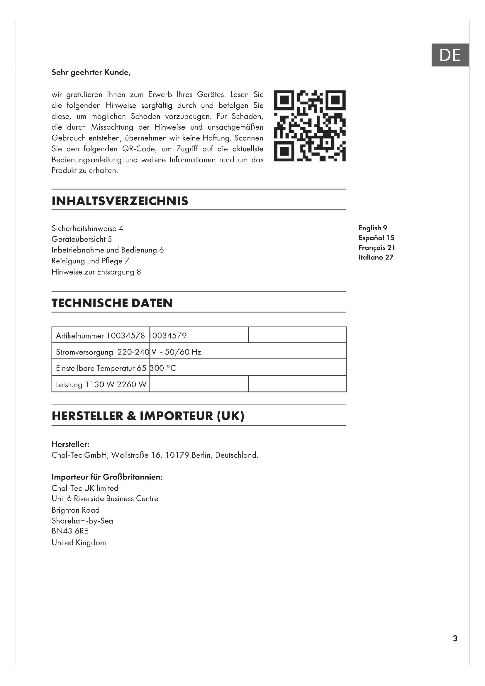 Sehr geehrter Kunde, wir gratulieren Ihnen zum Erwerb Ihres Gerätes. Lesen Sie die folgenden Hinweise sorgfältig durch und befolgen Sie diese, um möglichen Schäden vorzubeugen. Für Schäden, die durch Missachtung der Hinweise und unsachgemäßen Gebrauch entstehen, übernehmen wir keine Haftung. Scannen Sie den folgenden QR-Code, um Zugriff auf die aktuellste Bedienungsanleitung und weitere Informationen rund um das Produkt zu erhalten. INHALTSVERZEICHNIS Sicherheitshinweise4 Geräteübersicht5 Inbetriebnahme und Bedienung6 Reinigung und Pege7 Hinweise zur Entsorgung8 TECHNISCHE DATEN Artikelnummer 10034578 10034579 Stromversorgung 220-240 V ~ 50/60 Hz Einstellbare Temperatur 65-300°C Leistung 1130 W 2260 W HERSTELLER & IMPORTEUR (UK) Hersteller: Chal-Tec GmbH, Wallstraße 16, 10179 Berlin, Deutschland. Importeur für Großbritannien: Chal-Tec UK limited Unit 6 Riverside Business Centre Brighton Road Shoreham-by-Sea BN43 6RE United Kingdom English 9 Español 15 Français 21 Italiano 274