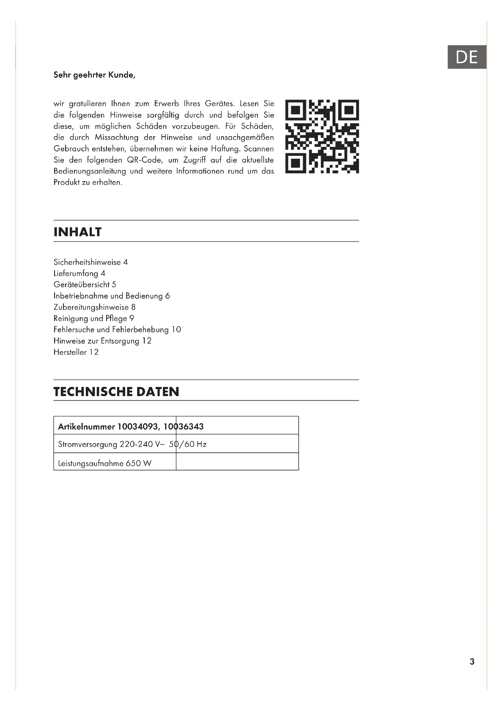 Sicherheitshinweise 4 Lieferumfang 4 Geräteübersicht 5 Inbetriebnahme und Bedienung 6 Zubereitungshinweise 8 Reinigung und Pege 9 Fehlersuche und Fehlerbehebung 10 Hinweise zur Entsorgung 12 Hersteller 12 INHALT TECHNISCHE DATEN Artikelnummer 10034093, 10036343 Stromversorgung 220-240 V~ 50/60 Hz Leistungsaufnahme 650 W Sehr geehrter Kunde, wir gratulieren Ihnen zum Erwerb Ihres Gerätes. Lesen Sie die folgenden Hinweise sorgfältig durch und befolgen Sie diese, um möglichen Schäden vorzubeugen. Für Schäden, die durch Missachtung der Hinweise und unsachgemäßen Gebrauch entstehen, übernehmen wir keine Haftung. Scannen Sie den folgenden QR-Code, um Zugriff auf die aktuellste Bedienungsanleitung und weitere Informationen rund um das Produkt zu erhalten.4