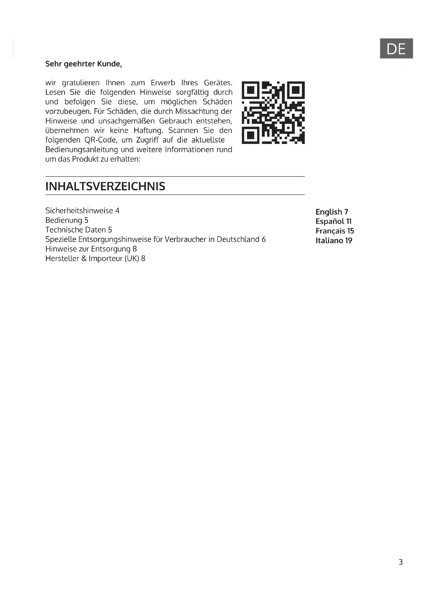 English 7 Español 11 Français 15 Italiano 19 Sehr geehrter Kunde, wir gratulieren Ihnen zum Erwerb Ihres Gerätes. Lesen Sie die folgenden Hinweise sorgfältig durch und befolgen Sie diese, um möglichen Schäden vorzubeugen. Für Schäden, die durch Missachtung der Hinweise und unsachgemäßen Gebrauch entstehen, übernehmen wir keine Haftung. Scannen Sie den folgenden QR-Code, um Zugri auf die aktuellste Bedienungsanleitung und weitere Informationen rund um das Produkt zu erhalten: INHALTSVERZEICHNIS Sicherheitshinweise 4 Bedienung 5 Technische Daten 5 Spezielle Entsorgungshinweise für Verbraucher in Deutschland 6 Hinweise zur Entsorgung 8 Hersteller & Importeur (UK) 84
