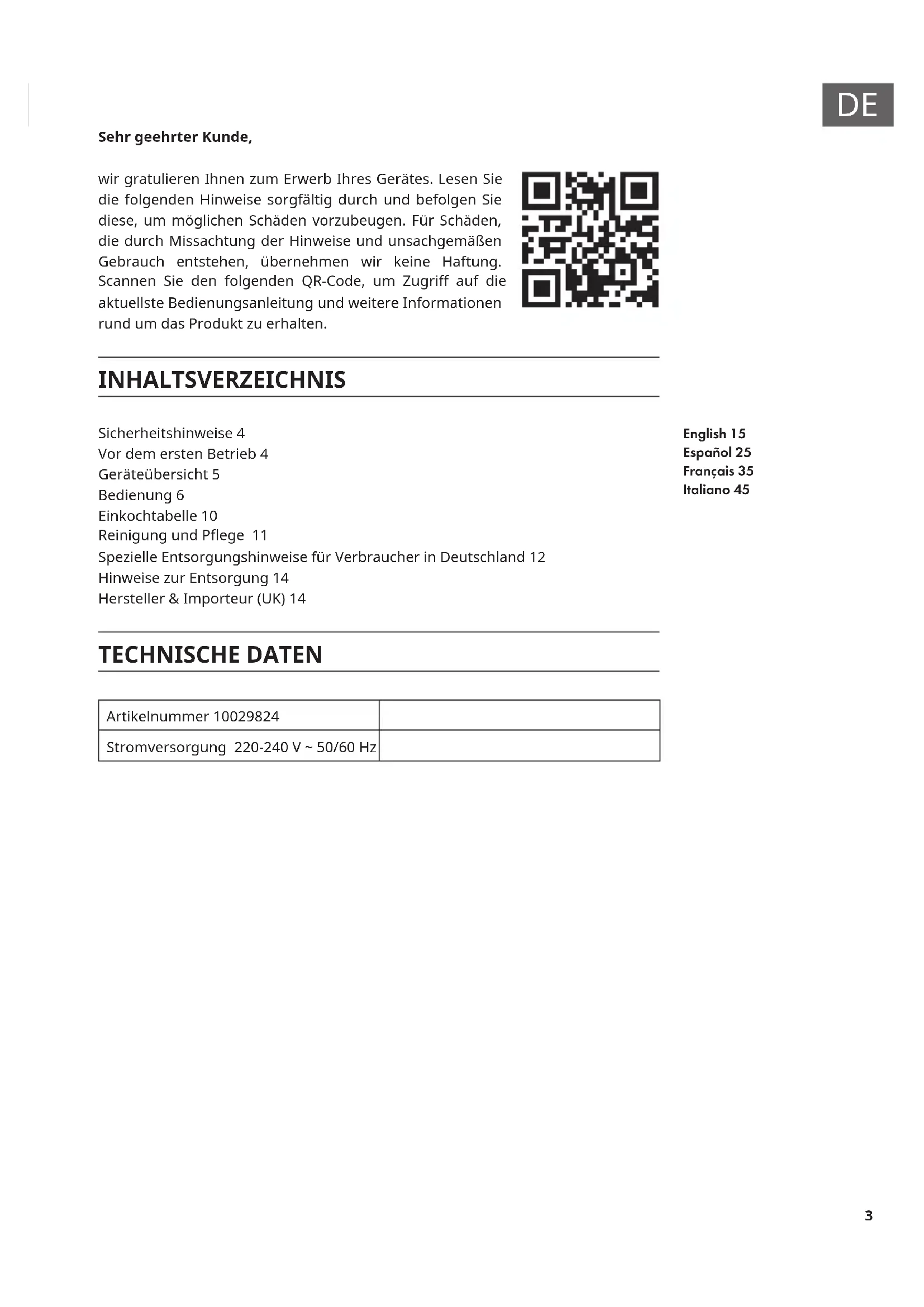 Sehr geehrter Kunde, wir gratulieren Ihnen zum Erwerb Ihres Gerätes. Lesen Sie die folgenden Hinweise sorgfältig durch und befolgen Sie diese, um möglichen Schäden vorzubeugen. Für Schäden, die durch Missachtung der Hinweise und unsachgemäßen Gebrauch entstehen, übernehmen wir keine Haftung. Scannen Sie den folgenden QR-Code, um Zugri auf die aktuellste Bedienungsanleitung und weitere Informationen rund um das Produkt zu erhalten. INHALTSVERZEICHNIS Sicherheitshinweise 4 Vor dem ersten Betrieb 4 Geräteübersicht 5 Bedienung 6 Einkochtabelle 10 Reinigung und Pege 11 Spezielle Entsorgungshinweise für Verbraucher in Deutschland 12 Hinweise zur Entsorgung 14 Hersteller & Importeur (UK) 14 TECHNISCHE DATEN Artikelnummer 10029824 Stromversorgung 220-240 V ~ 50/60 Hz English 15 Español 25 Français 35 Italiano 454