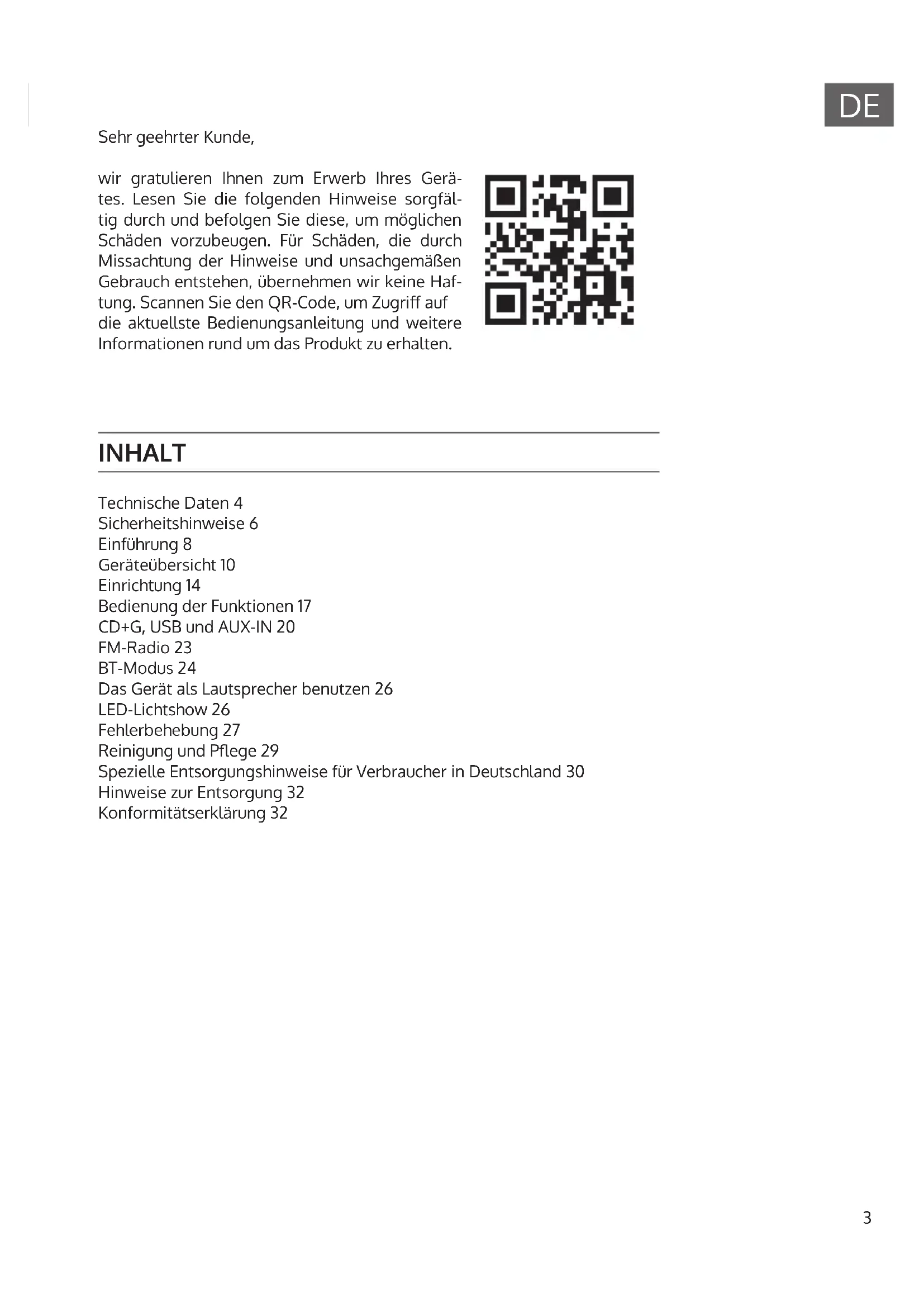 INHALT Technische Daten 4 Sicherheitshinweise 6 Einführung 8 Geräteübersicht 10 Einrichtung 14 Bedienung der Funktionen 17 CD+G, USB und AUX-IN 20 FM-Radio 23 BT-Modus 24 Das Gerät als Lautsprecher benutzen 26 LED-Lichtshow 26 Fehlerbehebung 27 Reinigung und Pege 29 Spezielle Entsorgungshinweise für Verbraucher in Deutschland 30 Hinweise zur Entsorgung 32 Konformitätserklärung 32 Sehr geehrter Kunde, wir gratulieren Ihnen zum Erwerb Ihres Gerä- tes. Lesen Sie die folgenden Hinweise sorgfäl- tig durch und befolgen Sie diese, um möglichen Schäden vorzubeugen. Für Schäden, die durch Missachtung der Hinweise und unsachgemäßen Gebrauch entstehen, übernehmen wir keine Haf- tung. Scannen Sie den QR-Code, um Zugri auf die aktuellste Bedienungsanleitung und weitere Informationen rund um das Produkt zu erhalten.4