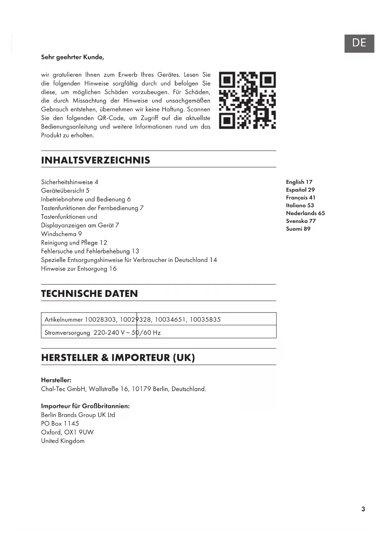 Sehr geehrter Kunde, wir gratulieren Ihnen zum Erwerb Ihres Gerätes. Lesen Sie die folgenden Hinweise sorgfältig durch und befolgen Sie diese, um möglichen Schäden vorzubeugen. Für Schäden, die durch Missachtung der Hinweise und unsachgemäßen Gebrauch entstehen, übernehmen wir keine Haftung. Scannen Sie den folgenden QR-Code, um Zugriff auf die aktuellste Bedienungsanleitung und weitere Informationen rund um das Produkt zu erhalten. INHALTSVERZEICHNIS Sicherheitshinweise4 Geräteübersicht5 Inbetriebnahme und Bedienung6 Tastenfunktionen der Fernbedienung7 Tastenfunktionen und Displayanzeigen am Gerät7 Windschema9 Reinigung und Pege12 Fehlersuche und Fehlerbehebung13 Spezielle Entsorgungshinweise für Verbraucher in Deutschland14 Hinweise zur Entsorgung16 TECHNISCHE DATEN Artikelnummer 10028303, 10029328, 10034651, 10035835 Stromversorgung 220-240 V ~ 50/60 Hz HERSTELLER & IMPORTEUR (UK) Hersteller: Chal-Tec GmbH, Wallstraße 16, 10179 Berlin, Deutschland. Importeur für Großbritannien: Berlin Brands Group UK Ltd PO Box 1145 Oxford, OX1 9UW United Kingdom English 17 Español 29 Français 41 Italiano 53 Nederlands 65 Svenska 77 Suomi 894