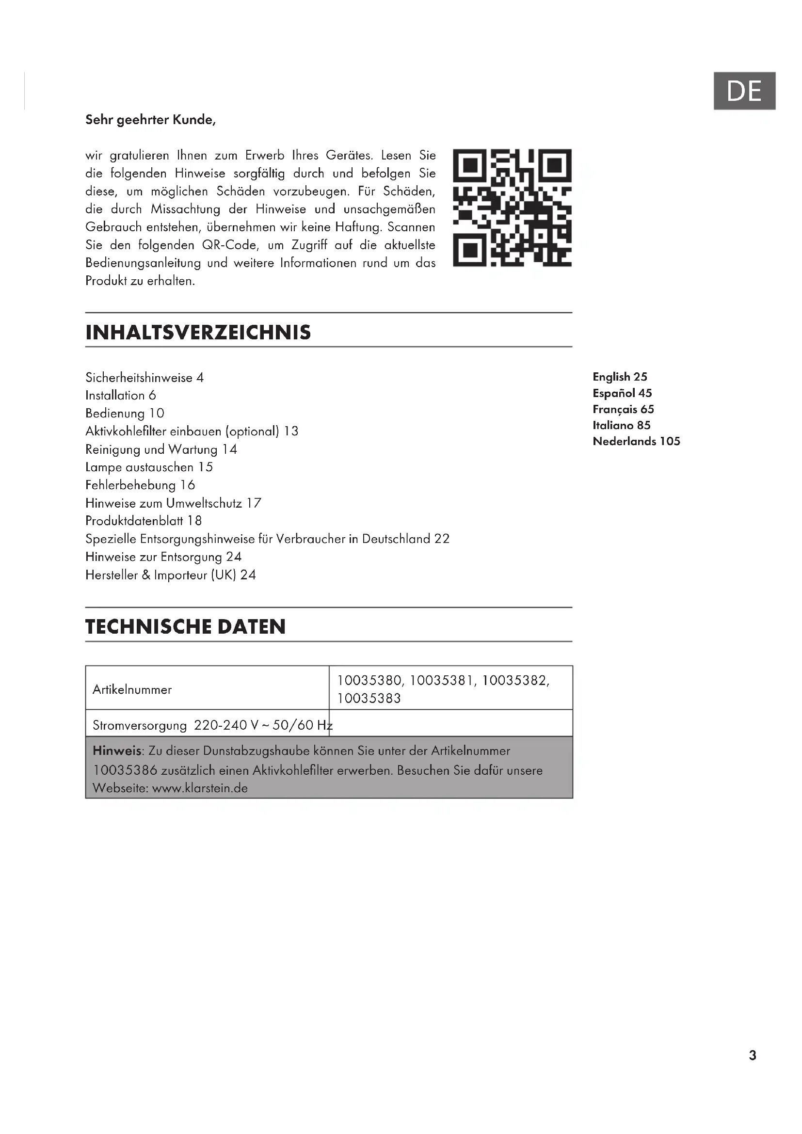 Sehr geehrter Kunde, wir gratulieren Ihnen zum Erwerb Ihres Gerätes. Lesen Sie die folgenden Hinweise sorgfältig durch und befolgen Sie diese, um möglichen Schäden vorzubeugen. Für Schäden, die durch Missachtung der Hinweise und unsachgemäßen Gebrauch entstehen, übernehmen wir keine Haftung. Scannen Sie den folgenden QR-Code, um Zugriff auf die aktuellste Bedienungsanleitung und weitere Informationen rund um das Produkt zu erhalten. INHALTSVERZEICHNIS Sicherheitshinweise4 Installation6 Bedienung10 Aktivkohlelter einbauen (optional)13 Reinigung und Wartung14 Lampe austauschen15 Fehlerbehebung16 Hinweise zum Umweltschutz17 Produktdatenblatt18 Spezielle Entsorgungshinweise für Verbraucher in Deutschland22 Hinweise zur Entsorgung24 Hersteller & Importeur (UK)24 TECHNISCHE DATEN Artikelnummer 10035380, 10035381, 10035382,
