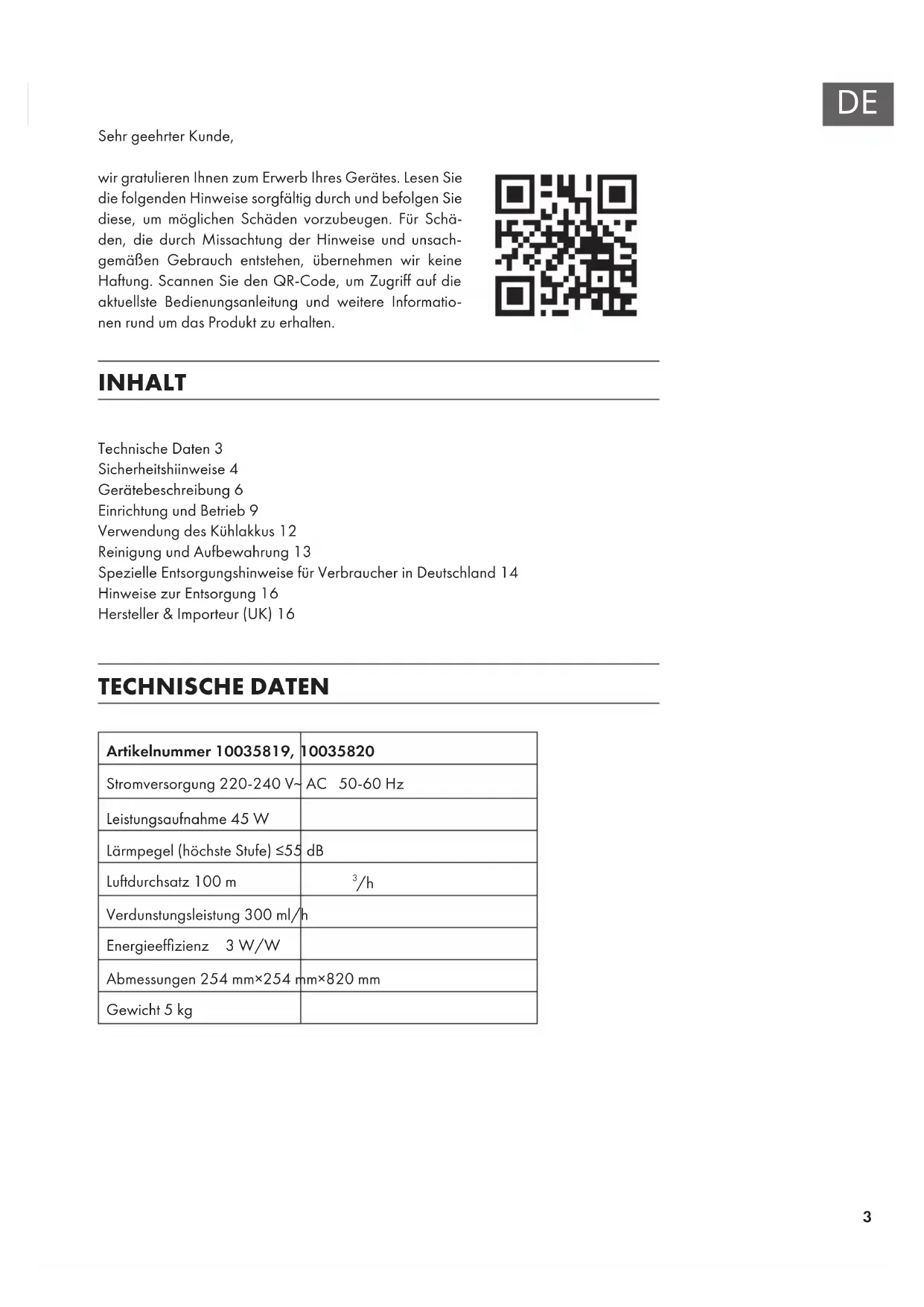 Verdunstungsleistung 300ml/h Energieefzienz 3W/W Abmessungen 254mm×254mm×820mm Gewicht 5kg Sehr geehrter Kunde, wir gratulieren Ihnen zum Erwerb Ihres Gerätes. Lesen Sie die folgenden Hinweise sorgfältig durch und befolgen Sie diese, um möglichen Schäden vorzubeugen. Für Schä- den, die durch Missachtung der Hinweise und unsach- gemäßen Gebrauch entstehen, übernehmen wir keine Haftung. Scannen Sie den QR-Code, um Zugriff auf die aktuellste Bedienungsanleitung und weitere Informatio- nen rund um das Produkt zu erhalten.4