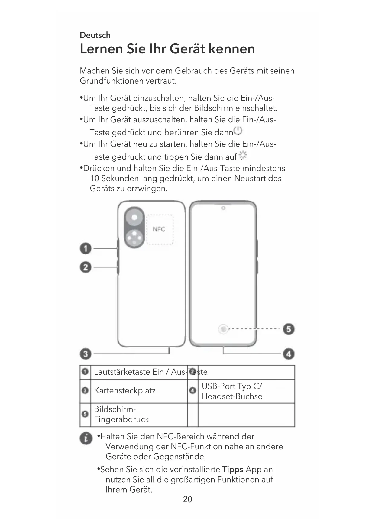 - Drücken und halten Sie die Ein-/Aus-Taste mindestens 10 Sekunden lang gedrückt, um einen Neustart des Geräts zu erzwingen. Lautstärketaste Ein / Aus-Taste Kartensteckplatz USB-Port Typ C/ Headset-Buchse Bildschirm- Fingerabdruck
