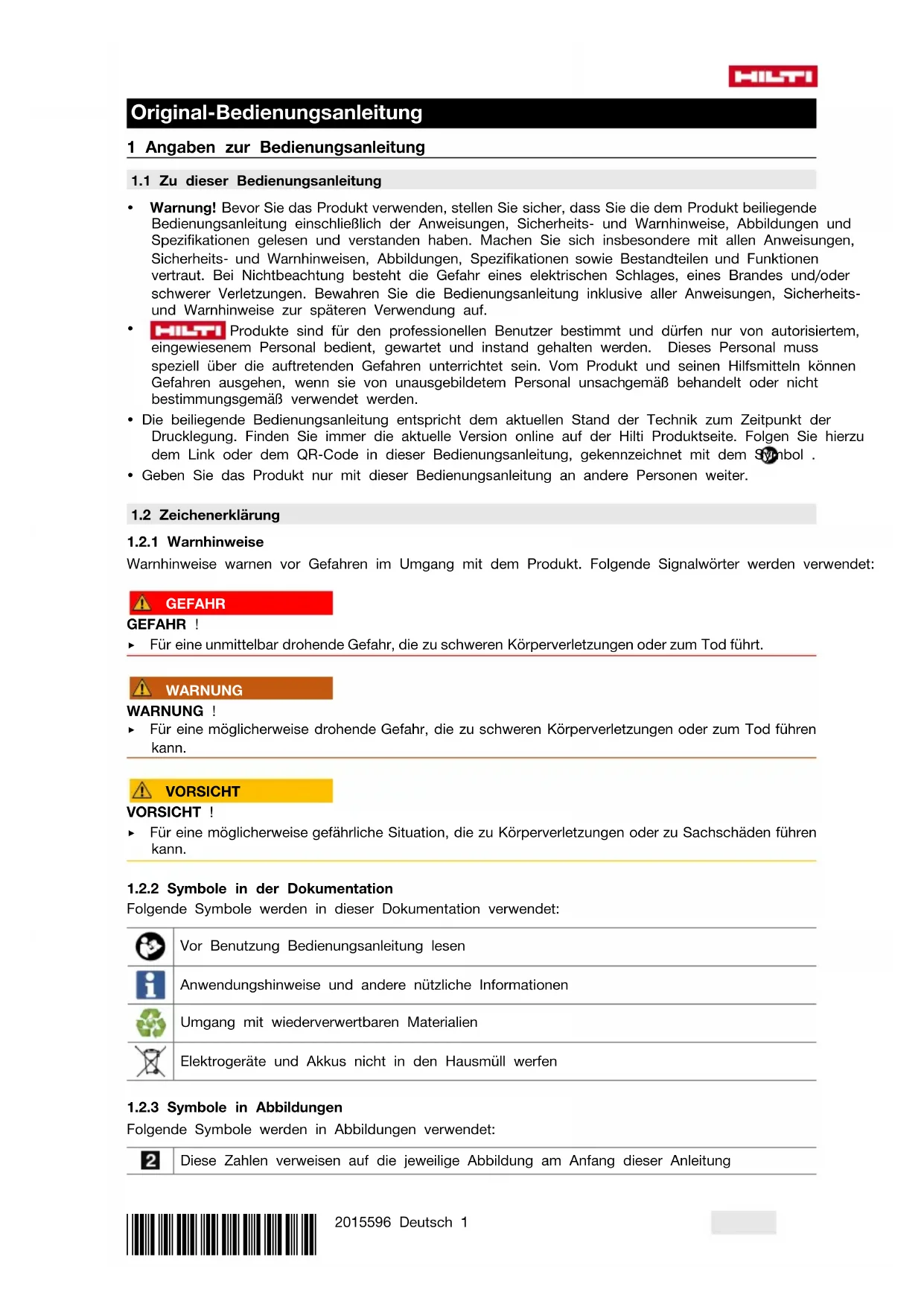 Folgende Symbole werden in Abbildungen verwendet: Diese Zahlen verweisen auf die jeweilige Abbildung am Anfang dieser Anleitung2 Deutsch 2015596 *2015596* Die Nummerierung gibt eine Abfolge der Arbeitsschritte im Bild wieder und kann von den Arbeits- schritten im Text abweichen Positionsnummern werden in der Abbildung Übersicht verwendet und verweisen auf die Num- mern der Legende im Abschnitt Produktübersicht Dieses Zeichen soll ihre besondere Aufmerksamkeit beim Umgang mit dem Produkt wecken.