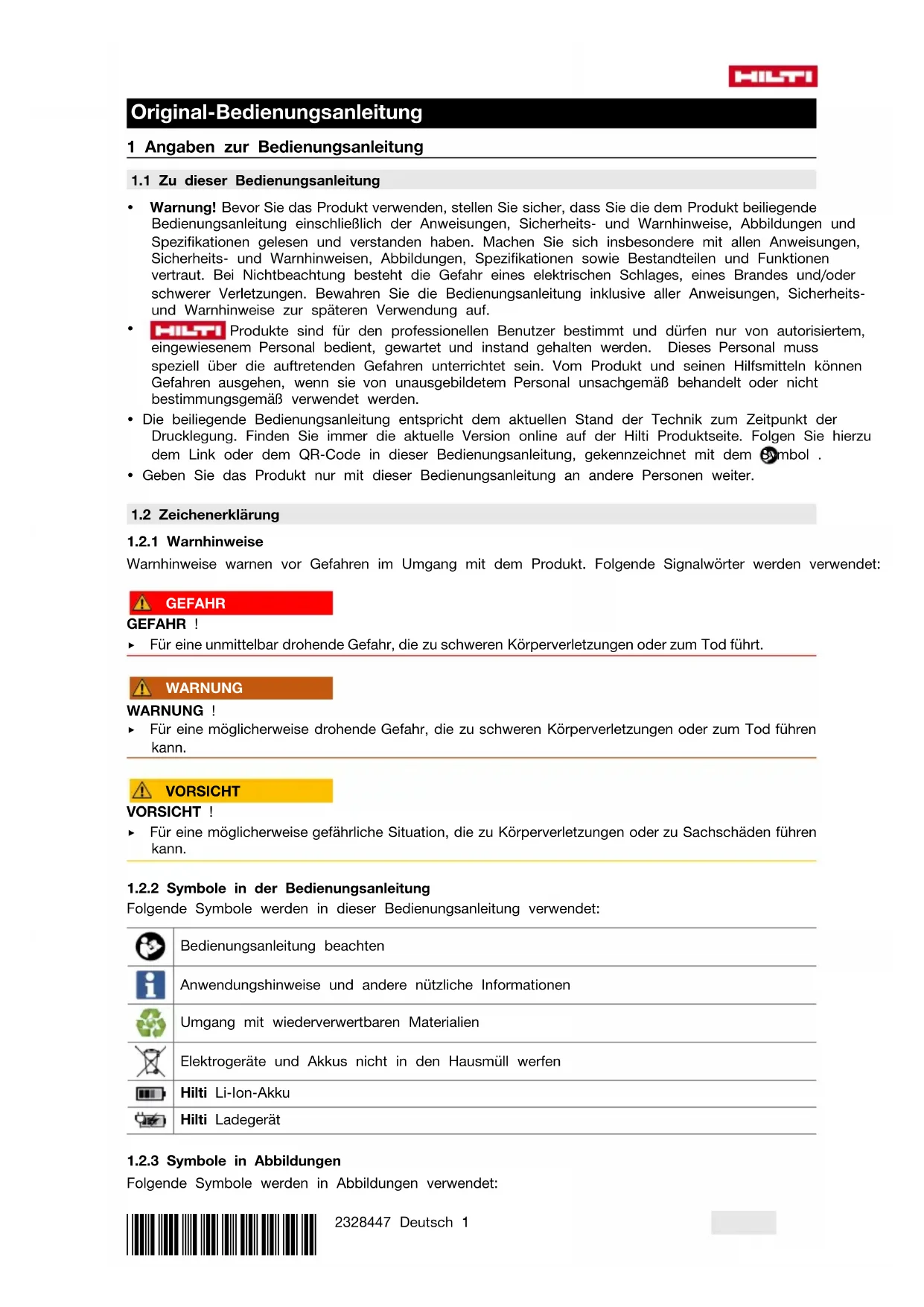 Siehe Verhalten bei beschädigten Akkus ▶ Durch unsachgemäße Entsorgung können Gesundheitsgefährdungen durch austretende Gase oder Flüssigkeiten entstehen. Entsorgen Sie den Akku in Ihrem Hilti Store oder wenden Sie sich an ihr zuständiges Müllentsorgungsunternehmen. Versenden oder verschicken Sie keine beschädigten Akkus! ▶ Werfen Sie Akkus nicht in den Hausmüll. ▶ Entsorgen Sie Akkus so, dass sie nicht in die Hände von Kindern gelangen können. Decken Sie die Anschlüsse mit einem nicht leitfähigen Material ab, um Kurzschlüsse zu vermeiden.*2328447* 2328447 English 23 Original operating instructions 1 Information about the operating instructions