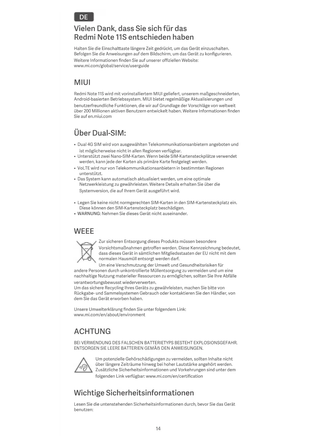 - WARNUNG: Nehmen Sie dieses Gerät nicht auseinander. WEEE Zur sicheren Entsorgung dieses Produkts müssen besondere Vorsichtsmaßnahmen getroffen werden. Diese Kennzeichnung bedeutet, dass dieses Gerät in sämtlichen Mitgliedsstaaten der EU nicht mit dem normalen Hausmüll entsorgt werden darf. Um eine Verschmutzung der Umwelt und Gesundheitsrisiken für andere Personen durch unkontrollierte Müllentsorgung zu vermeiden und um eine nachhaltige Nutzung materieller Ressourcen zu ermöglichen, sollten Sie Ihre Abfälle verantwortungsbewusst wiederverwerten. Um das sichere Recycling Ihres Geräts zu gewährleisten, machen Sie bie von Rückgabe- und Sammelsystemen Gebrauch oder kontaktieren Sie den Händler, von dem Sie das Gerät erworben haben. Unsere Umwelterklärung finden Sie unter folgendem Link: www.mi.com/en/about/environment ACHTUNG BEI VERWENDUNG DES FALSCHEN BATTERIETYPS BESTEHT EXPLOSIONSGEFAHR. ENTSORGEN SIE LEERE BATTERIEN GEMÄẞ DEN ANWEISUNGEN. Um potenzielle Gehörschädigungen zu vermeiden, sollten Inhalte nicht über längere Zeiträume hinweg bei hoher Lautstärke angehört werden. Zusätzliche Sicherheitsinformationen und Vorkehrungen sind unter dem folgenden Link verfügbar: www.mi.com/en/certification Wichtige Sicherheitsinformationen Lesen Sie die untenstehenden Sicherheitsinformationen durch, bevor Sie das Gerät benutzen: 14• Die Verwendung nicht zugelassene Kabel, Netzteile oder Baerien kann zu Bränden, Explosionen oder anderen Risiken führen.