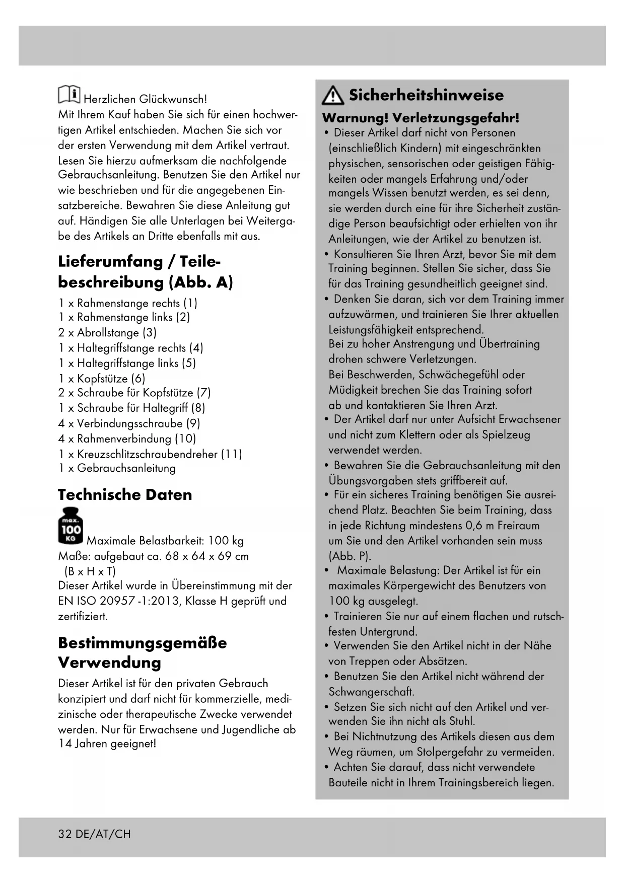 - Maximale Belastung: Der Artikel ist für ein maximales Körpergewicht des Benutzers von 100 kg ausgelegt.