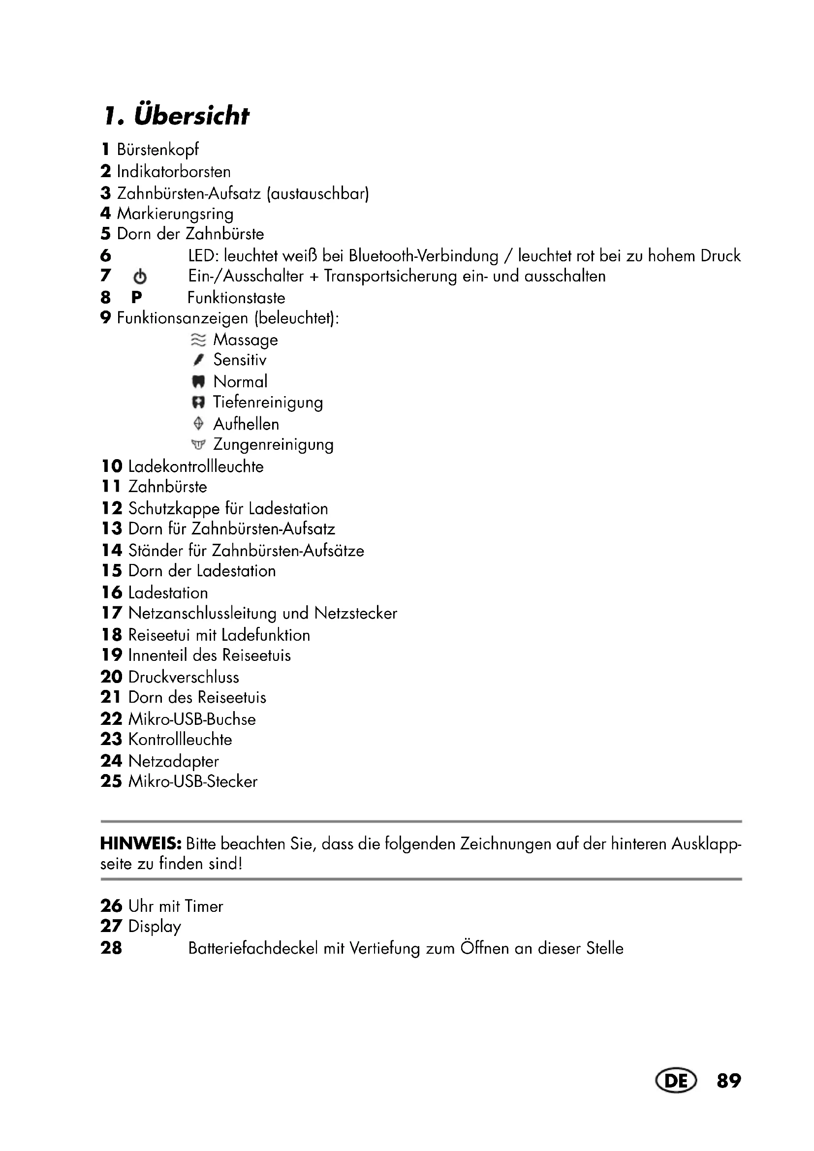 1 Bürstenkopf 2 Indikatorborsten 3 Zahnbürsten-Aufsatz (austauschbar) 4 Markierungsring 5 Dorn der Zahnbürste 6 LED: leuchtet weiß bei Bluetooth-Verbindung / leuchtet rot bei zu hohem Druck 7 Ein-/Ausschalter + Transportsicherung ein- und ausschalten 8P Funktionstaste 9 Funktionsanzeigen (beleuchtet): Massage Sensitiv Normal Tiefenreinigung Aufhellen Zungenreinigung 10 Ladekontrollleuchte 11 Zahnbürste 12 Schutzkappe für Ladestation 13 Dorn für Zahnbürsten-Aufsatz 14 Ständer für Zahnbürsten-Aufsätze 15 Dorn der Ladestation 16 Ladestation 17 Netzanschlussleitung und Netzstecker 18 Reiseetui mit Ladefunktion 19 Innenteil des Reiseetuis 20 Druckverschluss 21 Dorn des Reiseetuis 22 Mikro-USB-Buchse 23 Kontrollleuchte 24 Netzadapter 25 Mikro-USB-Stecker HINWEIS: Bitte beachten Sie, dass die folgenden Zeichnungen auf der hinteren Ausklapp- seite zu finden sind! 26 Uhr mit Timer 27 Display 28 Batteriefachdeckel mit Vertiefung zum Öffnen an dieser Stelle __321713_Zahnbuerste_B6.book Seite 89 Freitag, 19. Juli 2019 11:37 1190