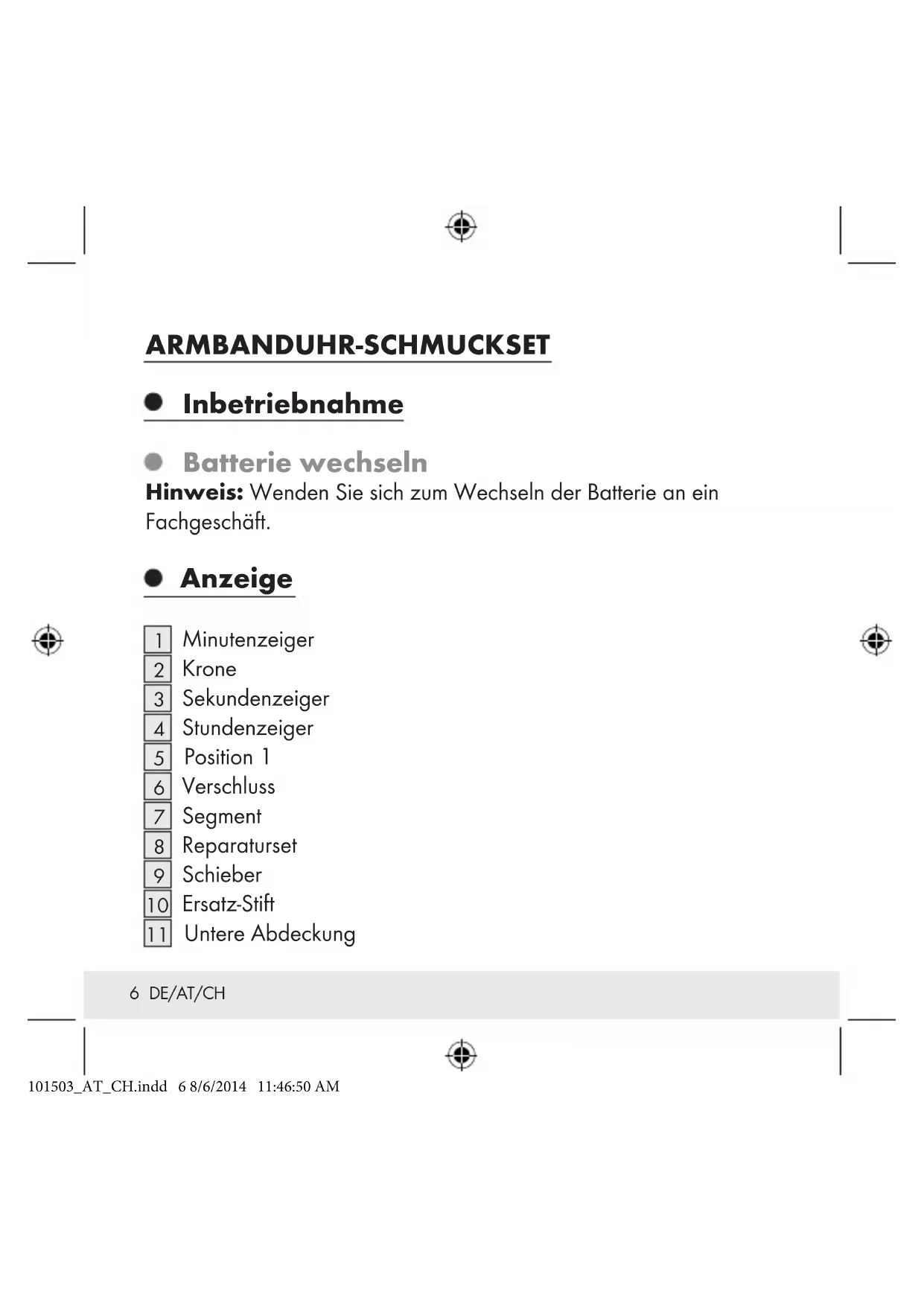 Umweltschäden durch falsche Entsorgung der Batterien! Batterien dürfen nicht über den Hausmüll entsorgt werden. Sie können giftige Schwermetalle enthalten und unterliegen der Sondermüllbehandlung. Die chemischen Symbole der Schwermetalle sind wie folgt: Cd = Cadmium, Hg = Quecksilber, Pb = Blei. Geben Sie deshalb verbrauchte Batterien bei einer kommunalen 101503_AT_CH.indd 11 8/6/2014 11:46:51 AM12 DE/AT/CH Sammelstelle ab. GARANTIE Das Produkt wurde nach strengen Qualitätsrichtlinien sorgfältig produziert und vor Anlieferung gewissenhaft geprüft. Im Falle von Mängeln dieses Produkts stehen Ihnen gegen den Verkäufer des Produkts gesetzliche Rechte zu. Diese gesetzlichen Rechte werden durch unsere im Folgenden dargestellte Garantie nicht eingeschränkt. Sie erhalten auf dieses Gerät 3 Jahre Garantie ab Kaufdatum. Die Garantiefrist beginnt mit dem Kaufdatum. Bitte bewahren Sie den Original Kassenbon gut auf. Diese Unterlage wird als Nachweis für den Kauf benötigt. Tritt innerhalb von drei Jahren ab dem Kaufdatum dieses Produkts ein Material- oder Fabrikationsfehler auf, wird das Produkt von uns – nach unserer Wahl – für Sie kostenlos repariert oder ersetzt. Diese Garantie verfällt, wenn das Produkt beschädigt, nicht sachgemäß benutzt oder gewartet wurde. 101503_AT_CH.indd 12 8/6/2014 11:46:51 AM13 DE/AT/CH Die Garantieleistung gilt für Material- oder Fabrikationsfehler. Diese Garantie erstreckt sich nicht auf Produktteile, die normaler Abnutzung ausgesetzt sind (z. B. Batterien) und daher als Verschleißteile angesehen werden können oder für Beschädigungen an zerbrechlichen Teilen, z. B. Schalter, Akkus oder die aus Glas gefertigt sind. Von der Garantieleistung ausgeschlossen ist ebenfalls das Nachlassen der Wasserdichtheit. Der Zustand der Wasserdichtheit ist keine bleibende Eigenschaft und sollte daher regelmäßig gewartet werden. Bitte beachten Sie, dass durch das Öffnen und Reparieren Ihrer Uhr durch Personen, die hierzu nicht ermächtigt sind, Ihre Garantieansprüche erlöschen. 101503_AT_CH.indd 13 8/6/2014 11:46:51 AM14 FR/CH