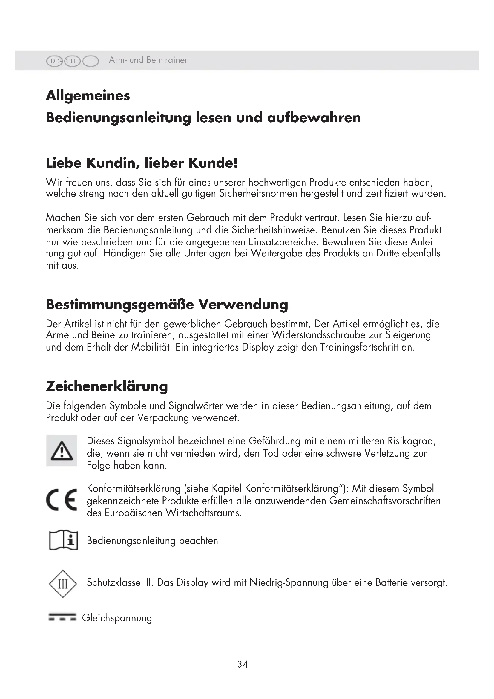 Allgemeines Bedienungsanleitung lesen und aufbewahren Liebe Kundin, lieber Kunde! Wir freuen uns, dass Sie sich für eines unserer hochwertigen Produkte entschieden haben, welche streng nach den aktuell gültigen Sicherheitsnormen hergestellt und zertiziert wurden. Machen Sie sich vor dem ersten Gebrauch mit dem Produkt vertraut. Lesen Sie hierzu auf- merksam die Bedienungsanleitung und die Sicherheitshinweise. Benutzen Sie dieses Produkt nur wie beschrieben und für die angegebenen Einsatzbereiche. Bewahren Sie diese Anlei- tung gut auf. Händigen Sie alle Unterlagen bei Weitergabe des Produkts an Dritte ebenfalls mit aus. Bestimmungsgemäße Verwendung Der Artikel ist nicht für den gewerblichen Gebrauch bestimmt. Der Artikel ermöglicht es, die Arme und Beine zu trainieren; ausgestattet mit einer Widerstandsschraube zur Steigerung und dem Erhalt der Mobilität. Ein integriertes Display zeigt den Trainingsfortschritt an. Zeichenerklärung Die folgenden Symbole und Signalwörter werden in dieser Bedienungsanleitung, auf dem Produkt oder auf der Verpackung verwendet. Dieses Signalsymbol bezeichnet eine Gefährdung mit einem mittleren Risikograd, die, wenn sie nicht vermieden wird, den Tod oder eine schwere Verletzung zur Folge haben kann. Konformitätserklärung (siehe Kapitel Konformitätserklärung“): Mit diesem Symbol gekennzeichnete Produkte erfüllen alle anzuwendenden Gemeinschaftsvorschriften des Europäischen Wirtschaftsraums. Bedienungsanleitung beachten Schutzklasse III. Das Display wird mit Niedrig-Spannung über eine Batterie versorgt. GleichspannungArm- und Beintrainer DE AT CH DE AT CH Arm- und Beintrainer