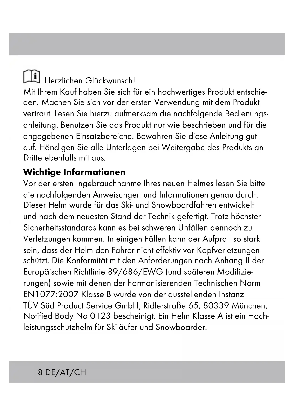 Herzlichen Glückwunsch! Mit Ihrem Kauf haben Sie sich für ein hochwertiges Produkt entschie- den. Machen Sie sich vor der ersten Verwendung mit dem Produkt vertraut. Lesen Sie hierzu aufmerksam die nachfolgende Bedienungs- anleitung. Benutzen Sie das Produkt nur wie beschrieben und für die angegebenen Einsatzbereiche. Bewahren Sie diese Anleitung gut auf. Händigen Sie alle Unterlagen bei Weitergabe des Produkts an Dritte ebenfalls mit aus. Wichtige Informationen Vor der ersten Ingebrauchnahme Ihres neuen Helmes lesen Sie bitte die nachfolgenden Anweisungen und Informationen genau durch. Dieser Helm wurde für das Ski- und Snowboardfahren entwickelt und nach dem neuesten Stand der Technik gefertigt. Trotz höchster Sicherheitsstandards kann es bei schweren Unfällen dennoch zu Verletzungen kommen. In einigen Fällen kann der Aufprall so stark sein, dass der Helm den Fahrer nicht effektiv vor Kopfverletzungen schützt. Die Konformität mit den Anforderungen nach Anhang II der Europäischen Richtlinie 89/686/EWG (und späteren Modifizie- rungen) sowie mit denen der harmonisierenden Technischen Norm EN1077:2007 Klasse B wurde von der ausstellenden Instanz TÜV Süd Product Service GmbH, Ridlerstraße 65, 80339 München, Notified Body No 0123 bescheinigt. Ein Helm Klasse A ist ein Hoch- leistungsschutzhelm für Skiläufer und Snowboarder.9DE/AT/CH Ein Helm Klasse B ist ein Helm für Skiläufer und Snowboarder, bei dem die Anforderungen etwas weniger einschränkend sind. Deshalb kann ein Helm Klasse B mehr Belüftung und Komfort bieten, ohne auf zuviel Schutz zu verzichten. Helme der Klasse A und der Klasse B sind für alpine Skiläufer, Snowboarder und ähnliche Gruppen. Helme der Klasse A bieten verhältnismäßig mehr Schutz. Helme der Klasse B können mehr Belüftung und besseres Hören bieten, schützen aber einen kleineren Bereich des Kopfes und geben ein geringeres Maß an Durchdringungsfestigkeit. Dieser Skihelm ist für die Verwendung mit Skibrillen geeignet. Achten Sie darauf, dass Ihre Skibrille exakt in den Helmausschnitt passt und nicht auf die Nasenwurzel drückt, wenn Sie den Helm fest geschlossen haben. Bestimmungsgemäße Verwendung Dieser Artikel ist für alpine Skiläufer, Snowboarder und ähnliche Gruppen gefertigt. Er ist nicht geeignet für andere Sportarten oder Motorradfahrer.10 DE/AT/CH
