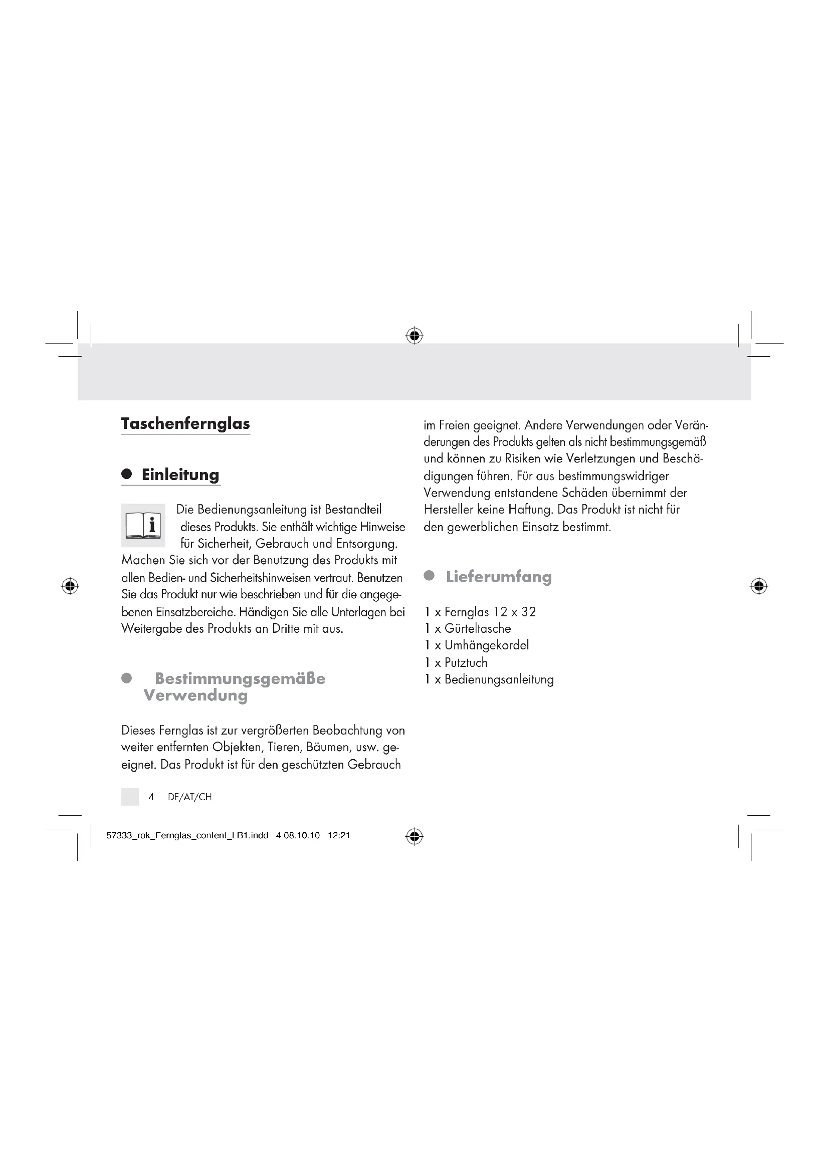 Lieferumfang 1 x Fernglas 12 x 32 1 x Gürteltasche 1 x Umhängekordel 1 x Putztuch 1 x Bedienungsanleitung 57333_rok_Fernglas_content_LB1.indd 4 08.10.10 12:215 DE/AT/CH