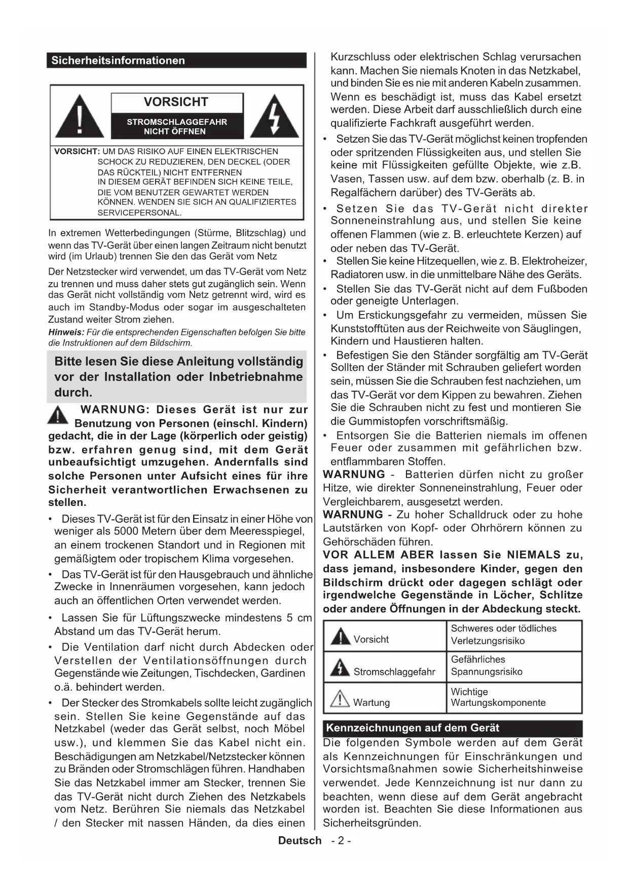 Vorsicht. Bitte beachten Sie die Bedienungsanleitung: Der markierte Bereich bzw. die markierten Bereiche enthalten durch den Benutzer auszutauschende Knopfzellenbatterien. CLASS 1 LASER PRODUCT Gerät der Laserklasse 1: Dieses Gerät enthält eine Laserquelle der Klasse 1, die unter vernünftigerweise vorhersehbaren Betriebsbedingungen ungefährlich ist. WARNUNG Batterien dürfen nicht verschluckt werden, es besteht chemische Verätzungsgefahr. Dieses Gerät bzw. das zum Gerät mitgelieferte Zube- hör enthält möglicherweise eine Knopfzellenbatterie. Wenn die Knopfzellenbatterie verschluckt wird, führt dies innerhalb 2 Stunden zu schweren internen Ver- ätzungen mit möglicher Todesfolge. Halten Sie gebrauchte und neue Batterien von Kin- dern fern. Wenn das Batteriefach nicht sicher geschlossen ist, stoppen Sie die Verwendung des Geräts und halten Sie Kinder fern. Falls Sie den Verdacht haben, dass Batterien ver- schluckt wurden oder in irgendeinen Körperteil platziert wurde, suchen Sie sofort medizinische Hilfe auf. – – – – – – – – – – – – Ein TV-Gerät kann umfallen und dabei ernste Ver- letzungen mit möglicher Todesfolge verursachen. Viele Verletzungen, insbesondere bei Kindern, können vermieden werden, wenn die folgenden einfachen Vorsichtsmaßnahmen getroffen werden: