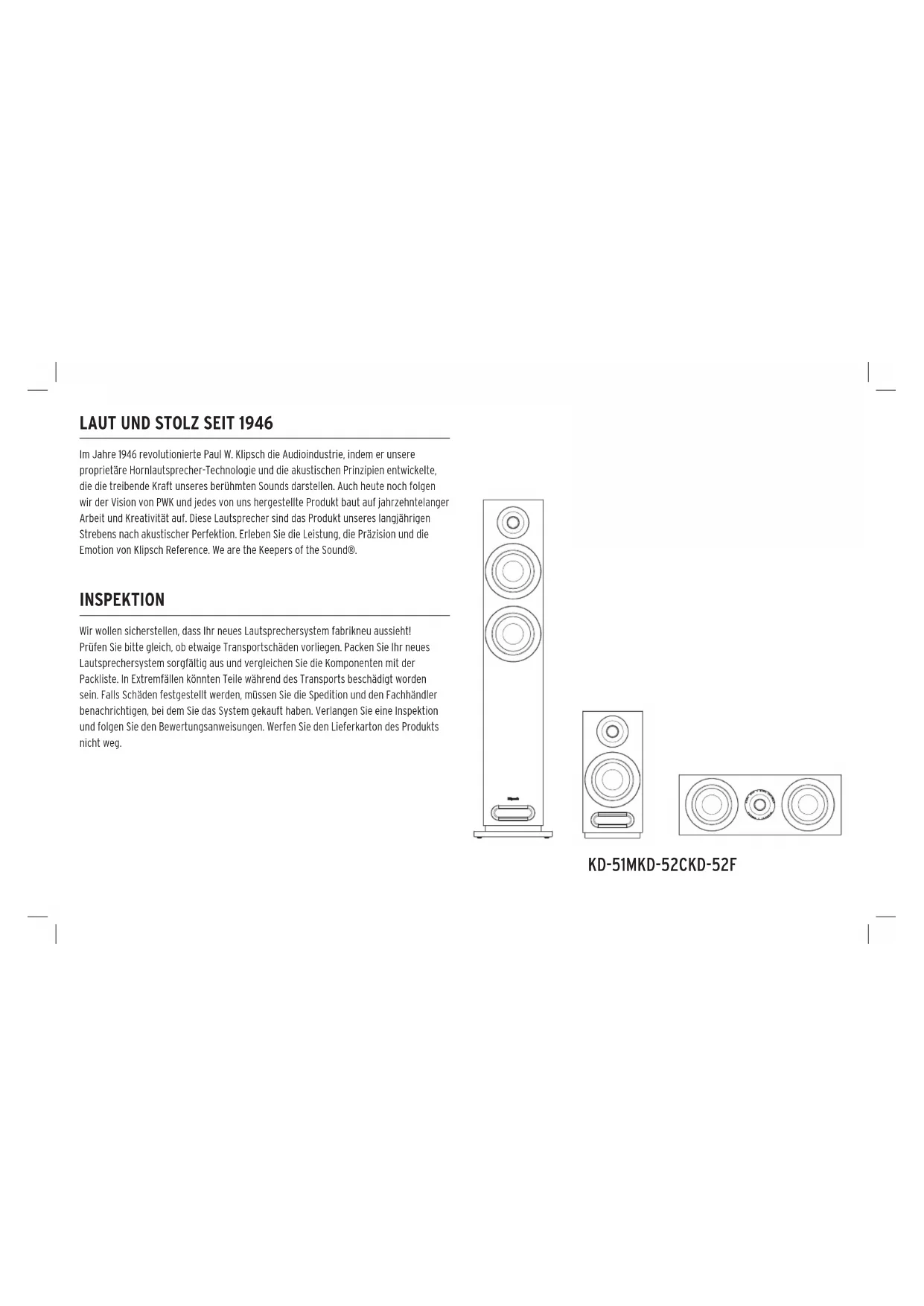 KD-52F or KD-51M KD-51M KD-52F or KD-51M KD-51M KD-52C KD-10SWWir wollen sicherstellen, dass Ihr neues Lautsprechersystem fabrikneu aussieht! Prüfen Sie bitte gleich, ob etwaige Transportschäden vorliegen. Packen Sie Ihr neues Lautsprechersystem sorgfältig aus und vergleichen Sie die Komponenten mit der Packliste. In Extremfällen könnten Teile während des Transports beschädigt worden sein. Falls Schäden festgestellt werden, müssen Sie die Spedition und den Fachhändler benachrichtigen, bei dem Sie das System gekauft haben. Verlangen Sie eine Inspektion und folgen Sie den Bewertungsanweisungen. Werfen Sie den Lieferkarton des Produkts nicht weg. INSPEKTION