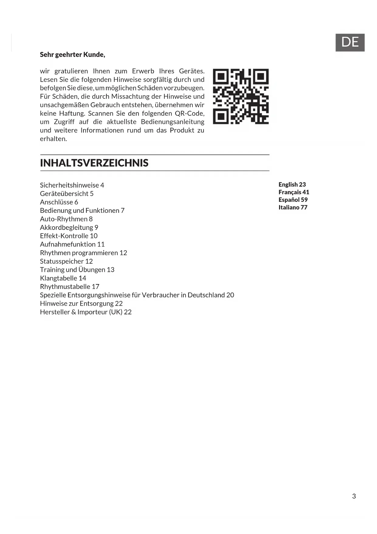 Sehr geehrter Kunde, wir gratulieren Ihnen zum Erwerb Ihres Gerätes. Lesen Sie die folgenden Hinweise sorgfältig durch und befolgen Sie diese, um möglichen Schäden vorzubeugen. Für Schäden, die durch Missachtung der Hinweise und unsachgemäßen Gebrauch entstehen, übernehmen wir keine Haftung. Scannen Sie den folgenden QR-Code, um Zugriff auf die aktuellste Bedienungsanleitung und weitere Informationen rund um das Produkt zu erhalten. INHALTSVERZEICHNIS Sicherheitshinweise 4 Geräteübersicht 5 Anschlüsse 6 Bedienung und Funktionen 7 Auto-Rhythmen 8 Akkordbegleitung 9 Effekt-Kontrolle 10 Aufnahmefunktion 11 Rhythmen programmieren 12 Statusspeicher 12 Training und Übungen 13 Klangtabelle 14 Rhythmustabelle 17 Spezielle Entsorgungshinweise für Verbraucher in Deutschland 20 Hinweise zur Entsorgung 22 Hersteller & Importeur (UK) 22 English 23 Français 41 Español 59 Italiano 774
