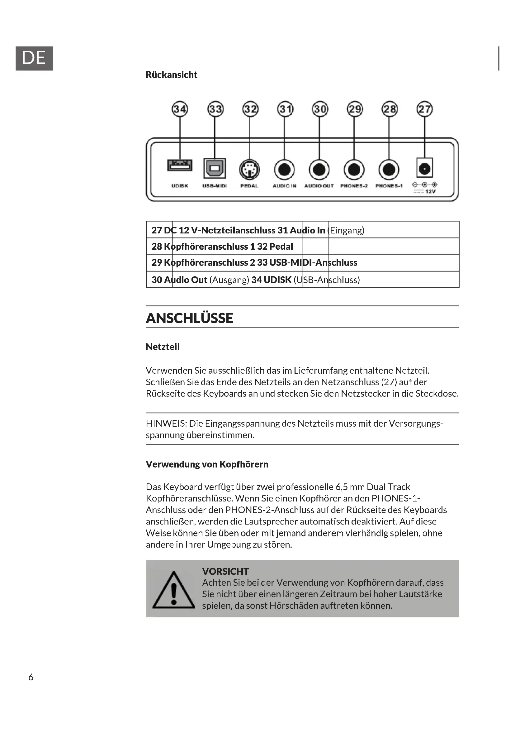 Rückansicht 27 DC 12 V-Netzteilanschluss 31 Audio In (Eingang) 28 Kopfhöreranschluss 1 32 Pedal 29 Kopfhöreranschluss 2 33 USB-MIDI-Anschluss 30 Audio Out (Ausgang) 34 UDISK (USB-Anschluss) ANSCHLÜSSE Netzteil Verwenden Sie ausschließlich das im Lieferumfang enthaltene Netzteil. Schließen Sie das Ende des Netzteils an den Netzanschluss (27) auf der Rückseite des Keyboards an und stecken Sie den Netzstecker in die Steckdose. HINWEIS: Die Eingangsspannung des Netzteils muss mit der Versorgungs- spannung übereinstimmen. Verwendung von Kopfhörern Das Keyboard verfügt über zwei professionelle 6,5 mm Dual Track Kopfhöreranschlüsse. Wenn Sie einen Kopfhörer an den PHONES-1- Anschluss oder den PHONES-2-Anschluss auf der Rückseite des Keyboards anschließen, werden die Lautsprecher automatisch deaktiviert. Auf diese Weise können Sie üben oder mit jemand anderem vierhändig spielen, ohne andere in Ihrer Umgebung zu stören. VORSICHT Achten Sie bei der Verwendung von Kopfhörern darauf, dass Sie nicht über einen längeren Zeitraum bei hoher Lautstärke spielen, da sonst Hörschäden auftreten können.7