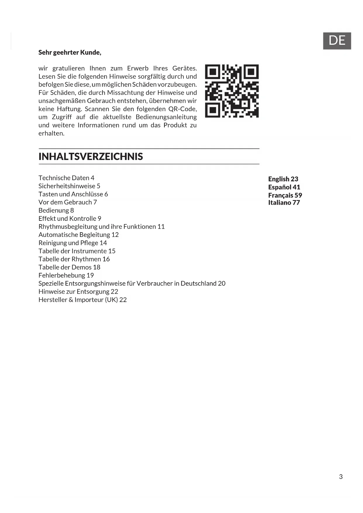 Sehr geehrter Kunde, wir gratulieren Ihnen zum Erwerb Ihres Gerätes. Lesen Sie die folgenden Hinweise sorgfältig durch und befolgen Sie diese, um möglichen Schäden vorzubeugen. Für Schäden, die durch Missachtung der Hinweise und unsachgemäßen Gebrauch entstehen, übernehmen wir keine Haftung. Scannen Sie den folgenden QR-Code, um Zugriff auf die aktuellste Bedienungsanleitung und weitere Informationen rund um das Produkt zu erhalten. INHALTSVERZEICHNIS Technische Daten 4 Sicherheitshinweise 5 Tasten und Anschlüsse 6 Vor dem Gebrauch 7 Bedienung 8 Effekt und Kontrolle 9 Rhythmusbegleitung und ihre Funktionen 11 Automatische Begleitung 12 Reinigung und Pege 14 Tabelle der Instrumente 15 Tabelle der Rhythmen 16 Tabelle der Demos 18 Fehlerbehebung 19 Spezielle Entsorgungshinweise für Verbraucher in Deutschland 20 Hinweise zur Entsorgung 22 Hersteller & Importeur (UK) 22 English 23 Español 41 Français 59 Italiano 774