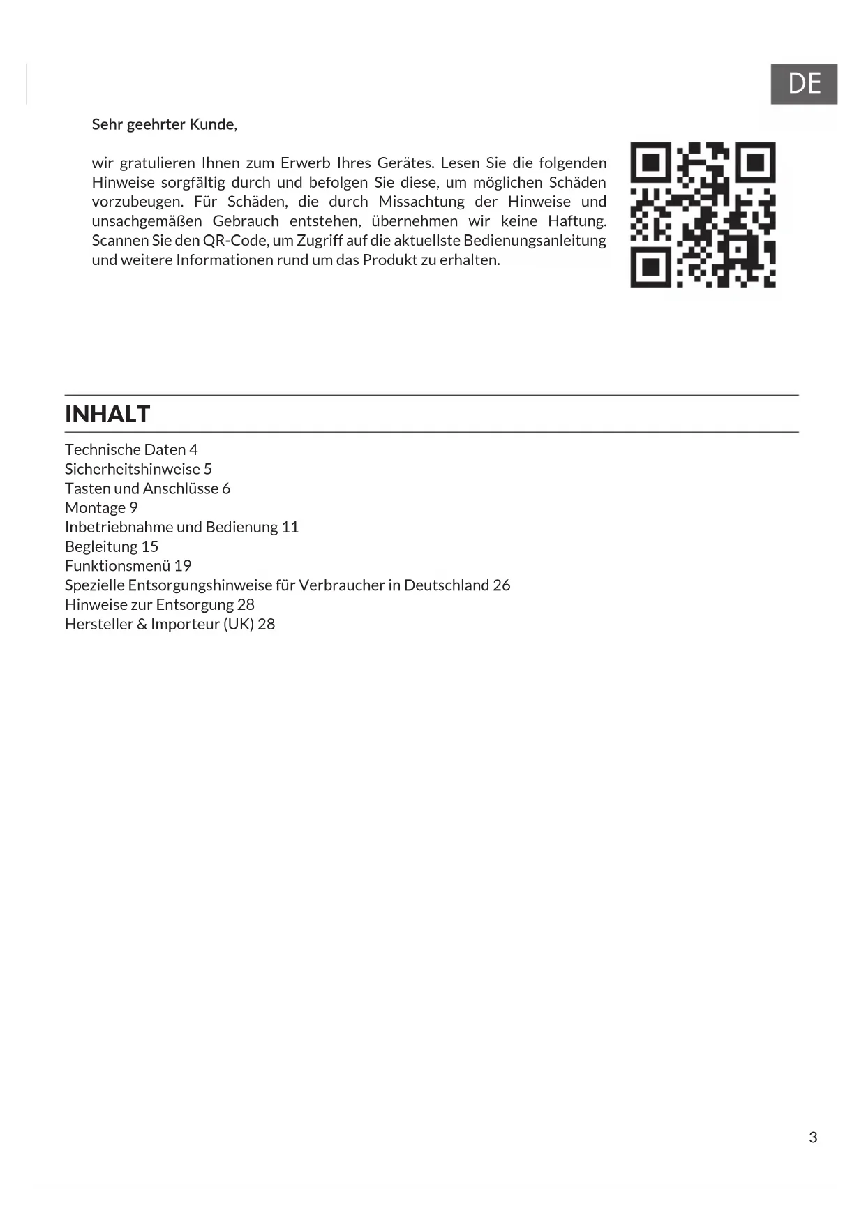 Sehr geehrter Kunde, wir gratulieren Ihnen zum Erwerb Ihres Gerätes. Lesen Sie die folgenden Hinweise sorgfältig durch und befolgen Sie diese, um möglichen Schäden vorzubeugen. Für Schäden, die durch Missachtung der Hinweise und unsachgemäßen Gebrauch entstehen, übernehmen wir keine Haftung. Scannen Sie den QR-Code, um Zugriff auf die aktuellste Bedienungsanleitung und weitere Informationen rund um das Produkt zu erhalten. INHALT Technische Daten 4 Sicherheitshinweise 5 Tasten und Anschlüsse 6 Montage 9 Inbetriebnahme und Bedienung 11 Begleitung 15 Funktionsmenü 19 Spezielle Entsorgungshinweise für Verbraucher in Deutschland 26 Hinweise zur Entsorgung 28 Hersteller & Importeur (UK) 28DE