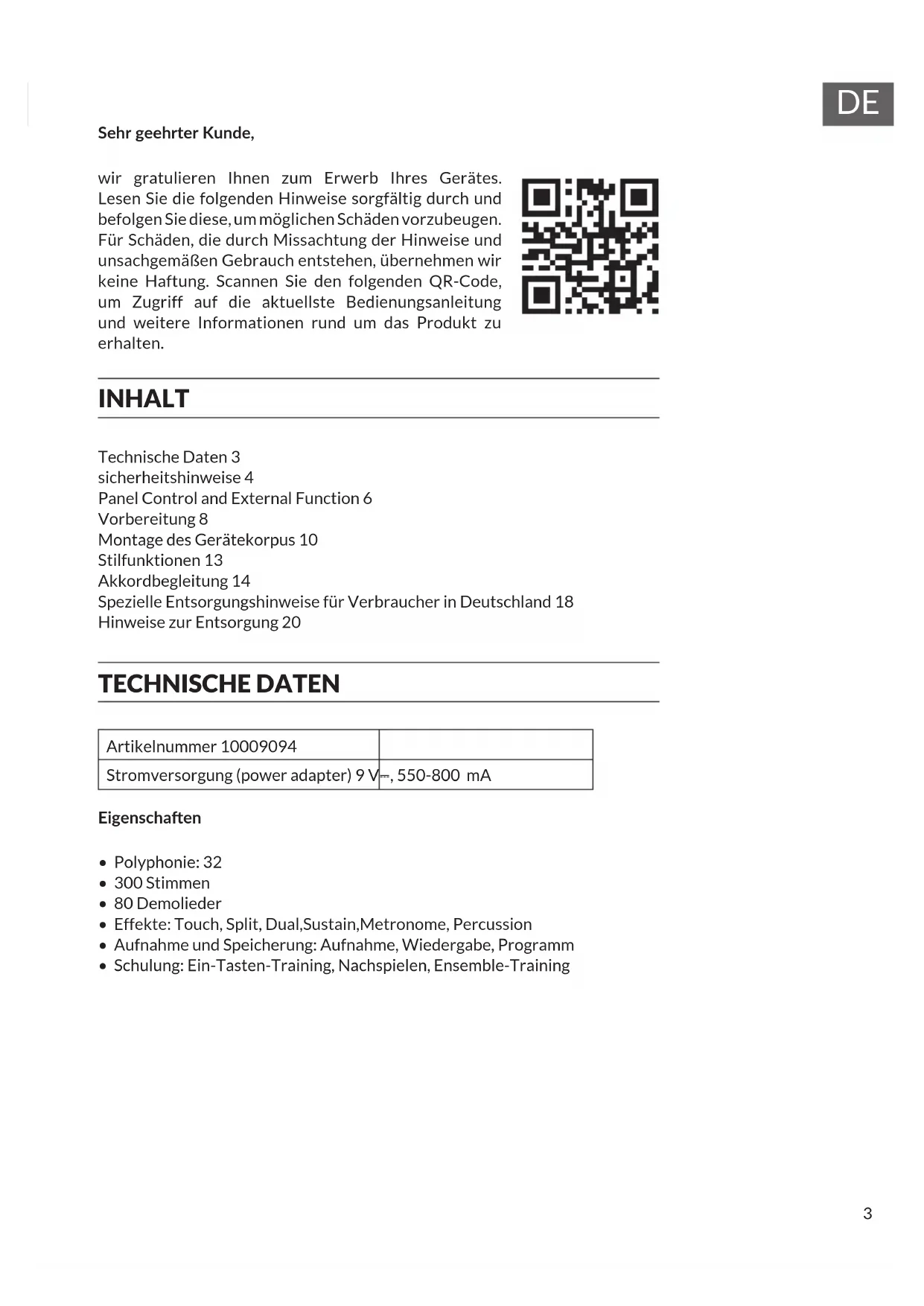 Sehr geehrter Kunde, wir gratulieren Ihnen zum Erwerb Ihres Gerätes. Lesen Sie die folgenden Hinweise sorgfältig durch und befolgen Sie diese, um möglichen Schäden vorzubeugen. Für Schäden, die durch Missachtung der Hinweise und unsachgemäßen Gebrauch entstehen, übernehmen wir keine Haftung. Scannen Sie den folgenden QR-Code, um Zugriff auf die aktuellste Bedienungsanleitung und weitere Informationen rund um das Produkt zu erhalten. TECHNISCHE DATEN Artikelnummer 10009094 Stromversorgung (power adapter) 9 V⎓, 550-800 mA Eigenschaen