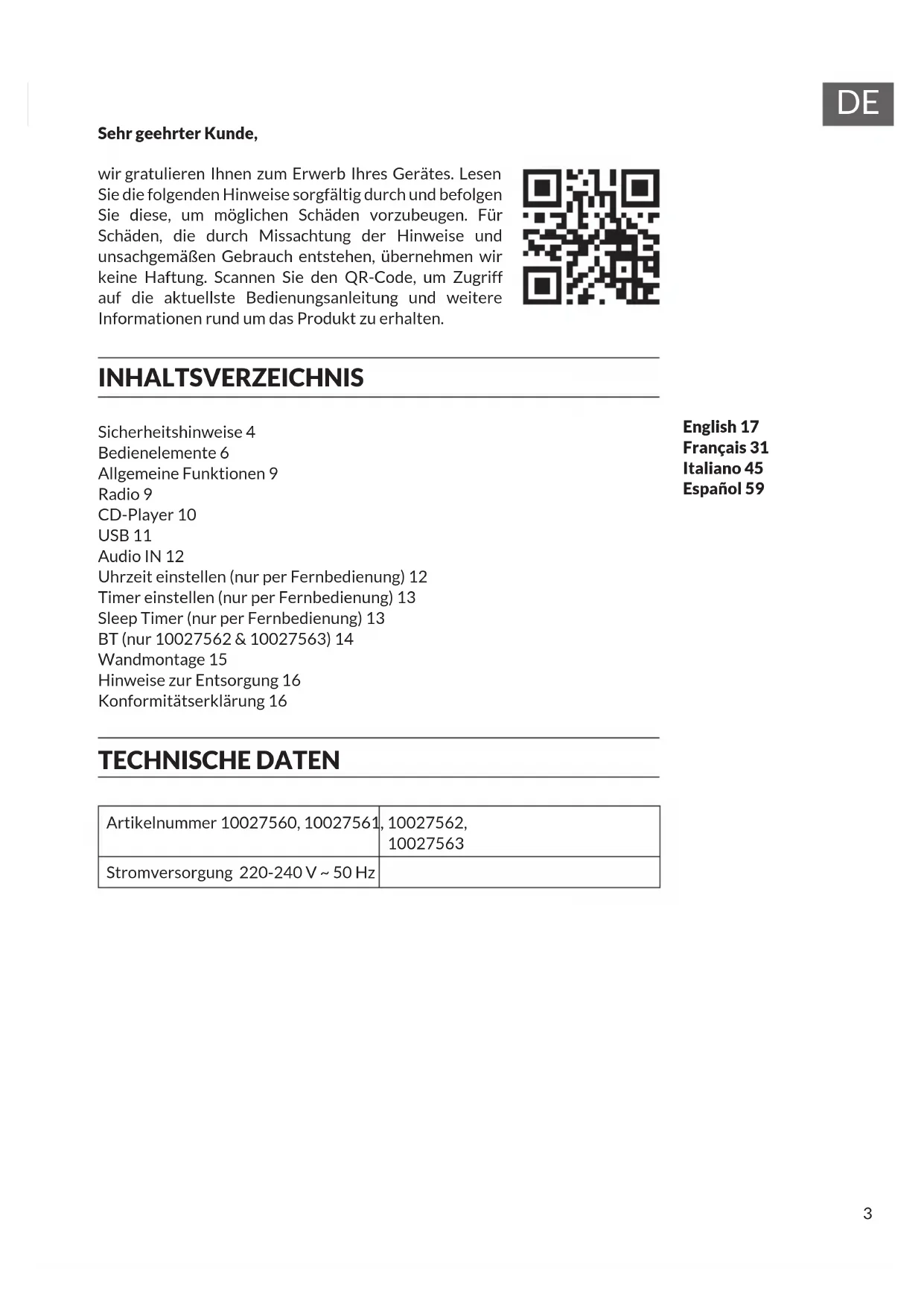 English 17 Français 31 Italiano 45 Español 59 Sehr geehrter Kunde, wir gratulieren Ihnen zum Erwerb Ihres Gerätes. Lesen Sie die folgenden Hinweise sorgfältig durch und befolgen Sie diese, um möglichen Schäden vorzubeugen. Für Schäden, die durch Missachtung der Hinweise und unsachgemäßen Gebrauch entstehen, übernehmen wir keine Haftung. Scannen Sie den QR-Code, um Zugriff auf die aktuellste Bedienungsanleitung und weitere Informationen rund um das Produkt zu erhalten. INHALTSVERZEICHNIS Sicherheitshinweise 4 Bedienelemente 6 Allgemeine Funktionen 9 Radio 9 CD-Player 10 USB 11 Audio IN 12 Uhrzeit einstellen (nur per Fernbedienung) 12 Timer einstellen (nur per Fernbedienung) 13 Sleep Timer (nur per Fernbedienung) 13 BT (nur 10027562 & 10027563) 14 Wandmontage 15 Hinweise zur Entsorgung 16 Konformitätserklärung 16 TECHNISCHE DATEN Artikelnummer 10027560, 10027561, 10027562,