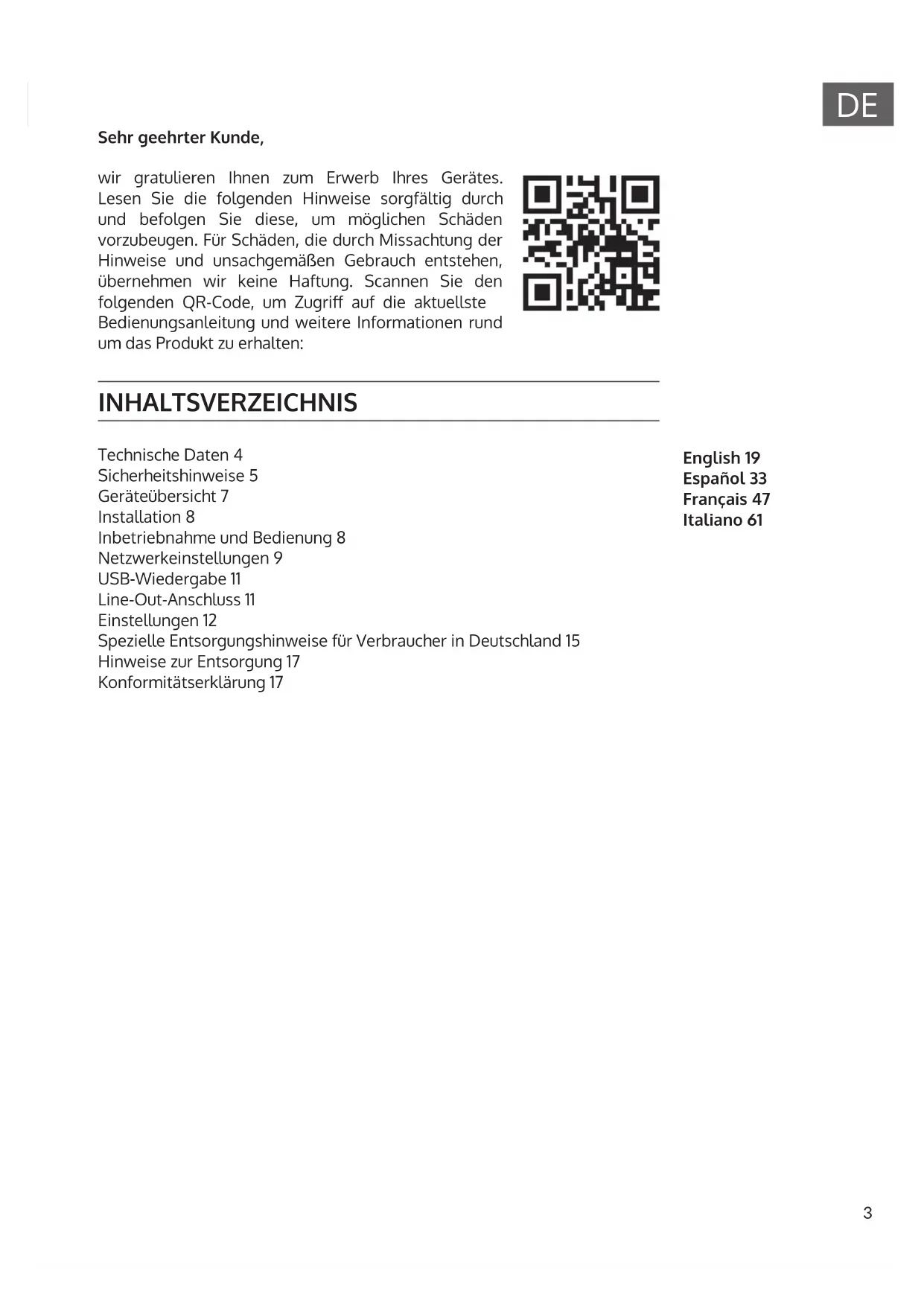 English 19 Español 33 Français 47 Italiano 61 Sehr geehrter Kunde, wir gratulieren Ihnen zum Erwerb Ihres Gerätes. Lesen Sie die folgenden Hinweise sorgfältig durch und befolgen Sie diese, um möglichen Schäden vorzubeugen. Für Schäden, die durch Missachtung der Hinweise und unsachgemäßen Gebrauch entstehen, übernehmen wir keine Haftung. Scannen Sie den folgenden QR-Code, um Zugri auf die aktuellste Bedienungsanleitung und weitere Informationen rund um das Produkt zu erhalten: INHALTSVERZEICHNIS Technische Daten 4 Sicherheitshinweise 5 Geräteübersicht 7 Installation 8 Inbetriebnahme und Bedienung 8 Netzwerkeinstellungen 9 USB-Wiedergabe 11 Line-Out-Anschluss 11 Einstellungen 12 Spezielle Entsorgungshinweise für Verbraucher in Deutschland 15 Hinweise zur Entsorgung 17 Konformitätserklärung 174