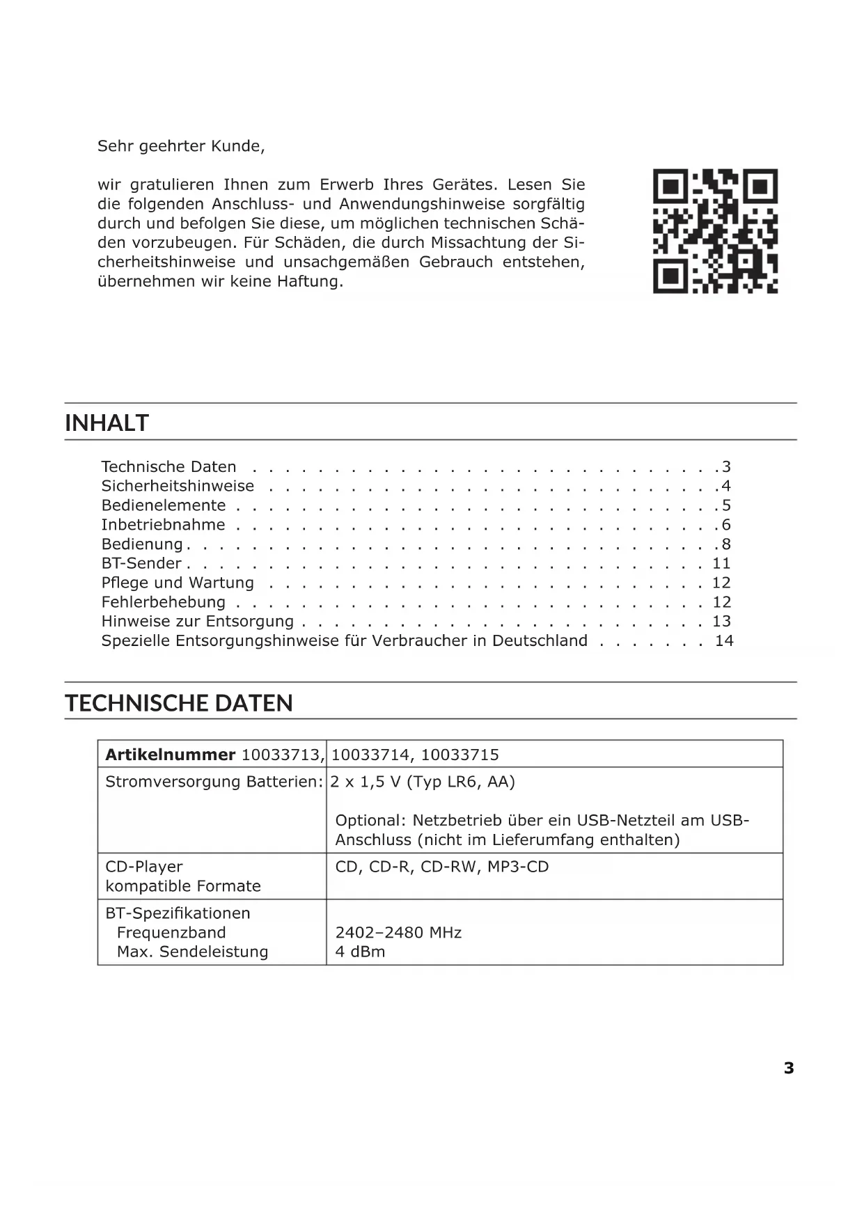 - Finden sich unter der durchgestrichenen Mülltonne auf der Batterie zusätzlich die Zeichen Cd, Hg oder Pb ist das ein Hinweis darauf, dass die Batterie gefährliche Schadstoffe enthält. (»Cd« steht für Cadmium, »Pb« für Blei und »Hg« für Quecksilber). Hinweis zur Abfallvermeidung Indem Sie die Lebensdauer Ihrer Altgeräte verlängern, tragen Sie dazu bei, Ressourcen efzient zu nutzen und zusätzlichen Müll zu vermeiden. Die Lebensdauer Ihrer Altgeräte können Sie verlängern indem Sie defekte Altgeräte reparieren lassen. Wenn sich Ihr Altgerät in gutem Zustand bendet, könnten Sie es spenden, verschenken oder verkaufen.16CONTENTS Dear Customer, Congratulations on purchasing this equipment. Please read this manual carefully and take care of the following hints on instal- lation and use to avoid technical damages. Any failure caused by ignoring the items and cautions mentioned in the operation and installation instructions are not covered by our warranty and any liability. Scan the QR code to get access to the latest user manual and other information about the product. Technical Data . . . . . . . . . . . . . . . . . . . . . . . . . . . . . . 17 Safety Instructions . . . . . . . . . . . . . . . . . . . . . . . . . . . . 18 Controls . . . . . . . . . . . . . . . . . . . . . . . . . . . . . . . . . 19 Power Source . . . . . . . . . . . . . . . . . . . . . . . . . . . . . . 20 Operation . . . . . . . . . . . . . . . . . . . . . . . . . . . . . . . . 22 BT Transmitter Mode . . . . . . . . . . . . . . . . . . . . . . . . . . . 25 Care and Maintenance . . . . . . . . . . . . . . . . . . . . . . . . . . 25 Troubleshooting Guide . . . . . . . . . . . . . . . . . . . . . . . . . . 26 Disposal Considerations . . . . . . . . . . . . . . . . . . . . . . . . . 27 Declaration of Conformity . . . . . . . . . . . . . . . . . . . . . . . . . 27 TECHNICAL DATA Item number 10033713, 10033714, 10033715 Power supply Batteries 2x1.5 V (type LR6, AA) Optional: power adaptor (not included) (output 4.5 V ; 500 mA) via USB port CD player (compatible formats) CD, CD-R, CD-RW, CD-MP3 BT specications Frequency band Maximum radio-frequency power 2402–2480 MHz 4 dBm 17SAFETY INSTRUCTIONS