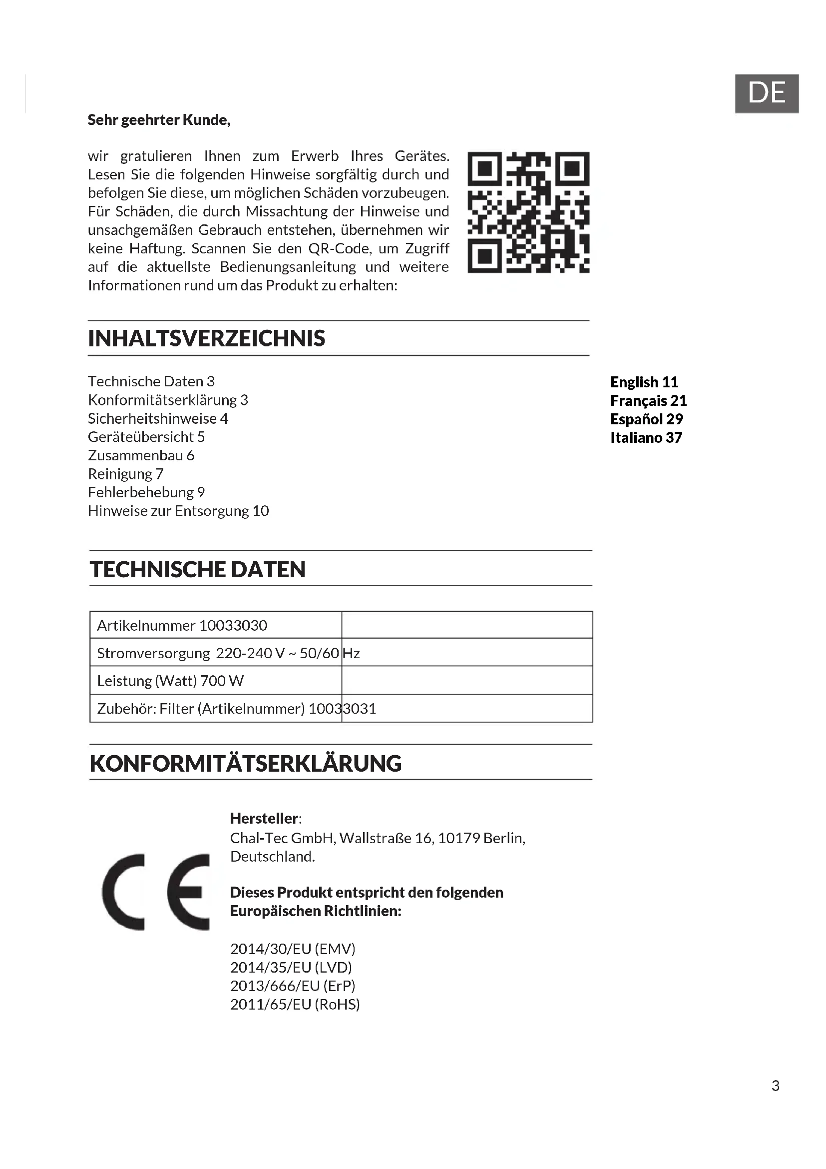 English 11 Français 21 Español 29 Italiano 37 Technische Daten 3 Konformitätserklärung 3 Sicherheitshinweise 4 Geräteübersicht 5 Zusammenbau 6 Reinigung 7 Fehlerbehebung 9 Hinweise zur Entsorgung 10 Sehr geehrter Kunde, wir gratulieren Ihnen zum Erwerb Ihres Gerätes. Lesen Sie die folgenden Hinweise sorgfältig durch und befolgen Sie diese, um möglichen Schäden vorzubeugen. Für Schäden, die durch Missachtung der Hinweise und unsachgemäßen Gebrauch entstehen, übernehmen wir keine Haftung. Scannen Sie den QR-Code, um Zugriff auf die aktuellste Bedienungsanleitung und weitere Informationen rund um das Produkt zu erhalten: INHALTSVERZEICHNIS TECHNISCHE DATEN Artikelnummer 10033030 Stromversorgung 220-240 V ~ 50/60 Hz Leistung (Watt) 700 W Zubehör: Filter (Artikelnummer) 10033031
