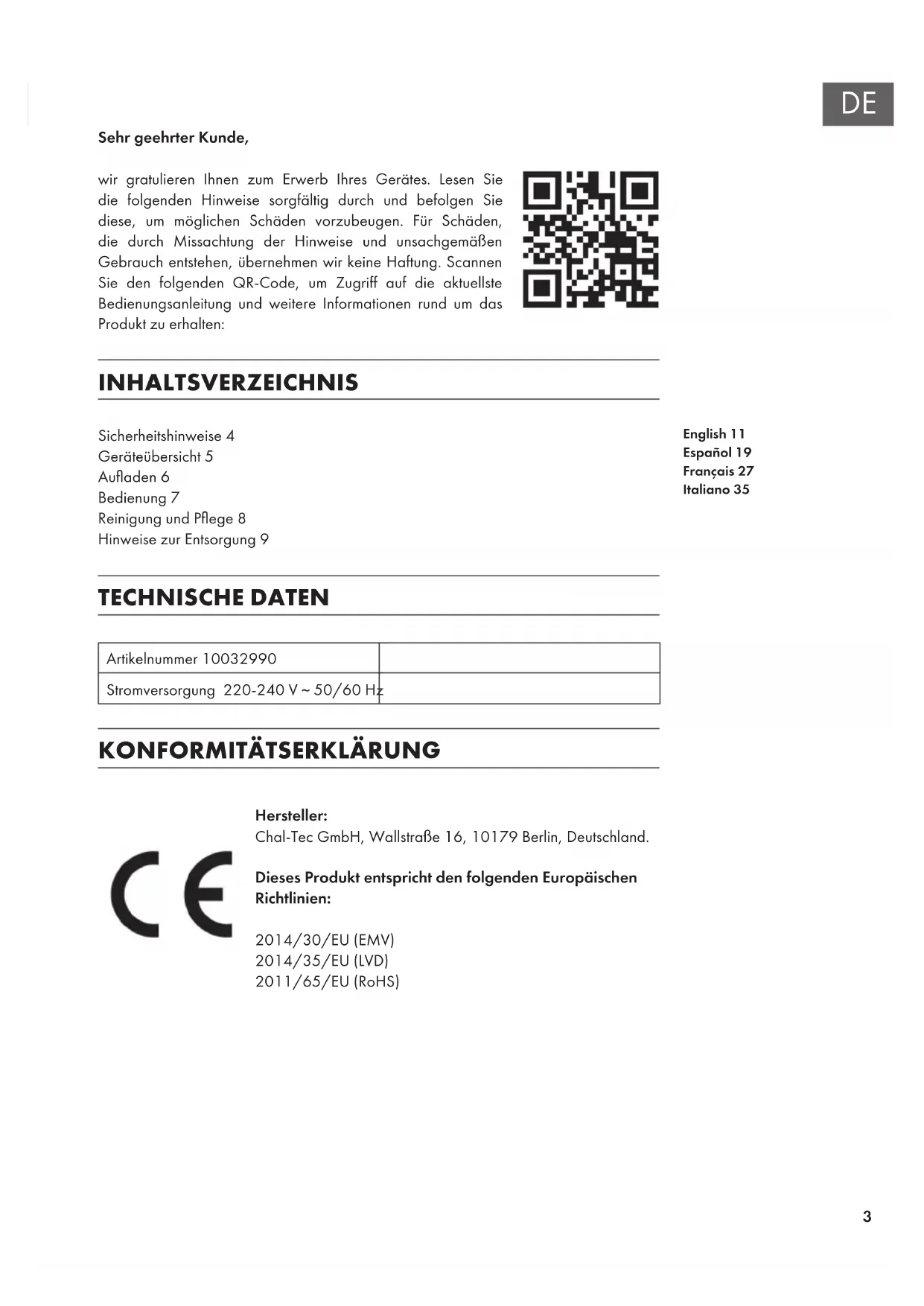 Hersteller: Chal-Tec GmbH, Wallstraße 16, 10179 Berlin, Deutschland. Dieses Produkt entspricht den folgenden Europäischen Richtlinien: 2014/30/EU (EMV) 2014/35/EU (LVD) 2011/65/EU (RoHS) English 11 Español 19 Français 27 Italiano 354