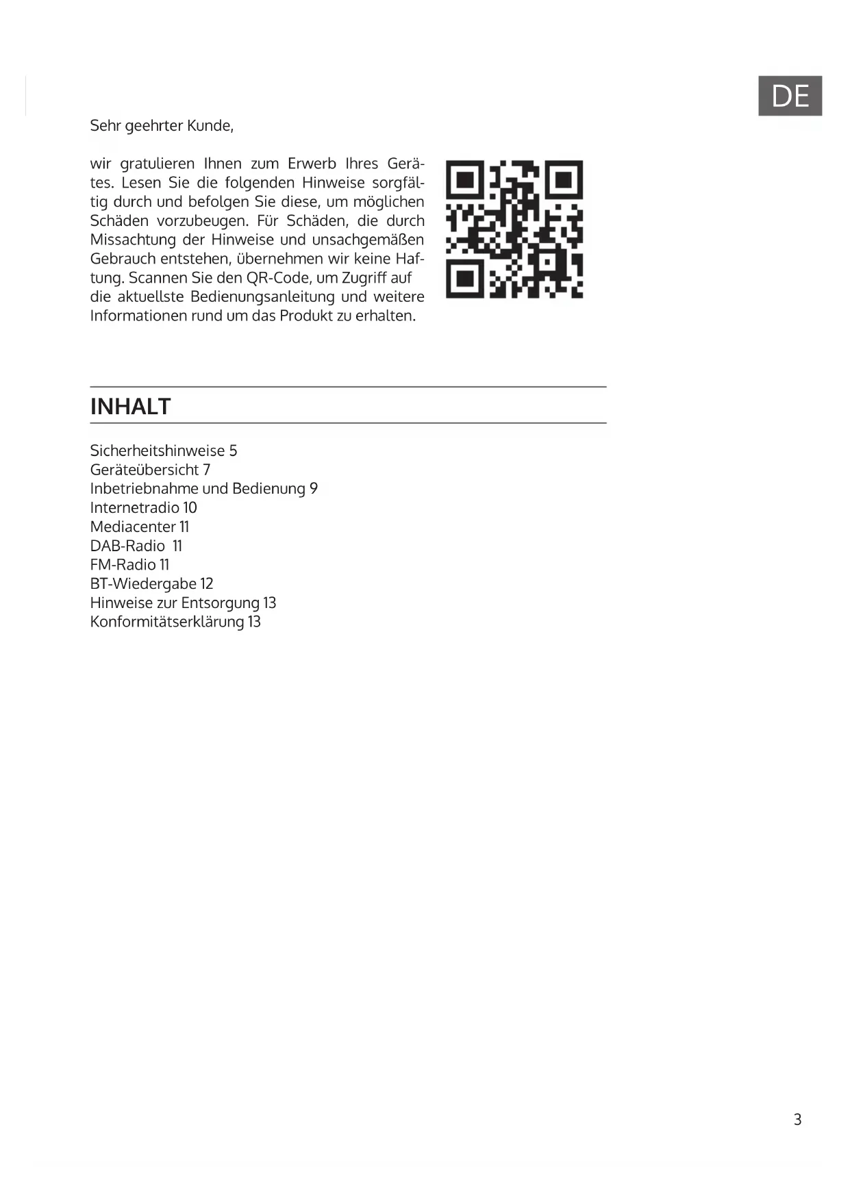 INHALT Sicherheitshinweise 5 Geräteübersicht 7 Inbetriebnahme und Bedienung 9 Internetradio 10 Mediacenter 11 DAB-Radio 11 FM-Radio 11 BT-Wiedergabe 12 Hinweise zur Entsorgung 13 Konformitätserklärung 13 Sehr geehrter Kunde, wir gratulieren Ihnen zum Erwerb Ihres Gerä- tes. Lesen Sie die folgenden Hinweise sorgfäl- tig durch und befolgen Sie diese, um möglichen Schäden vorzubeugen. Für Schäden, die durch Missachtung der Hinweise und unsachgemäßen Gebrauch entstehen, übernehmen wir keine Haf- tung. Scannen Sie den QR-Code, um Zugri auf die aktuellste Bedienungsanleitung und weitere Informationen rund um das Produkt zu erhalten.4
